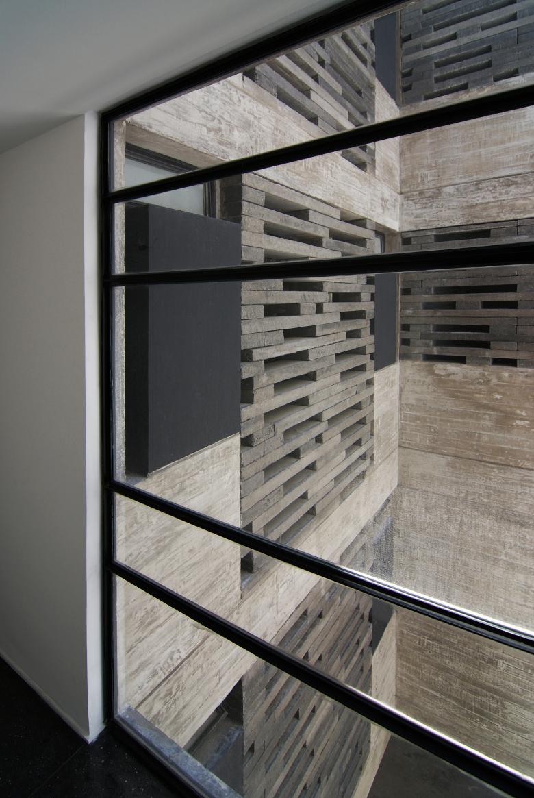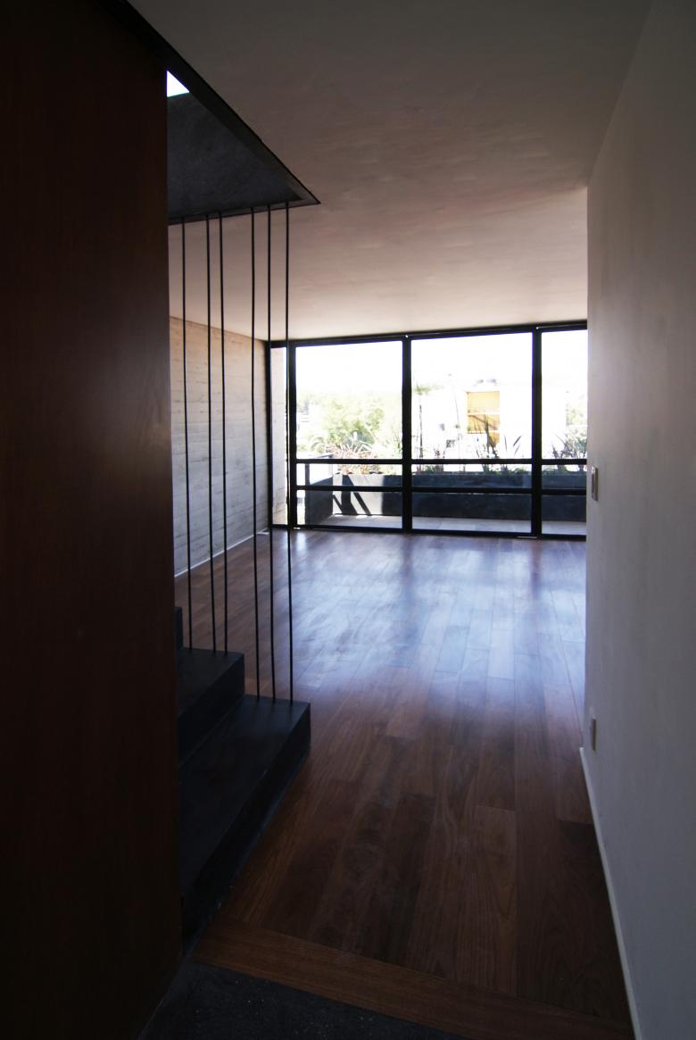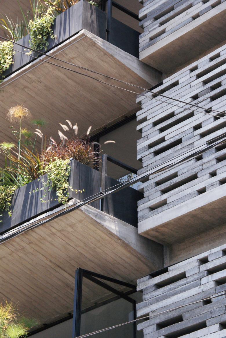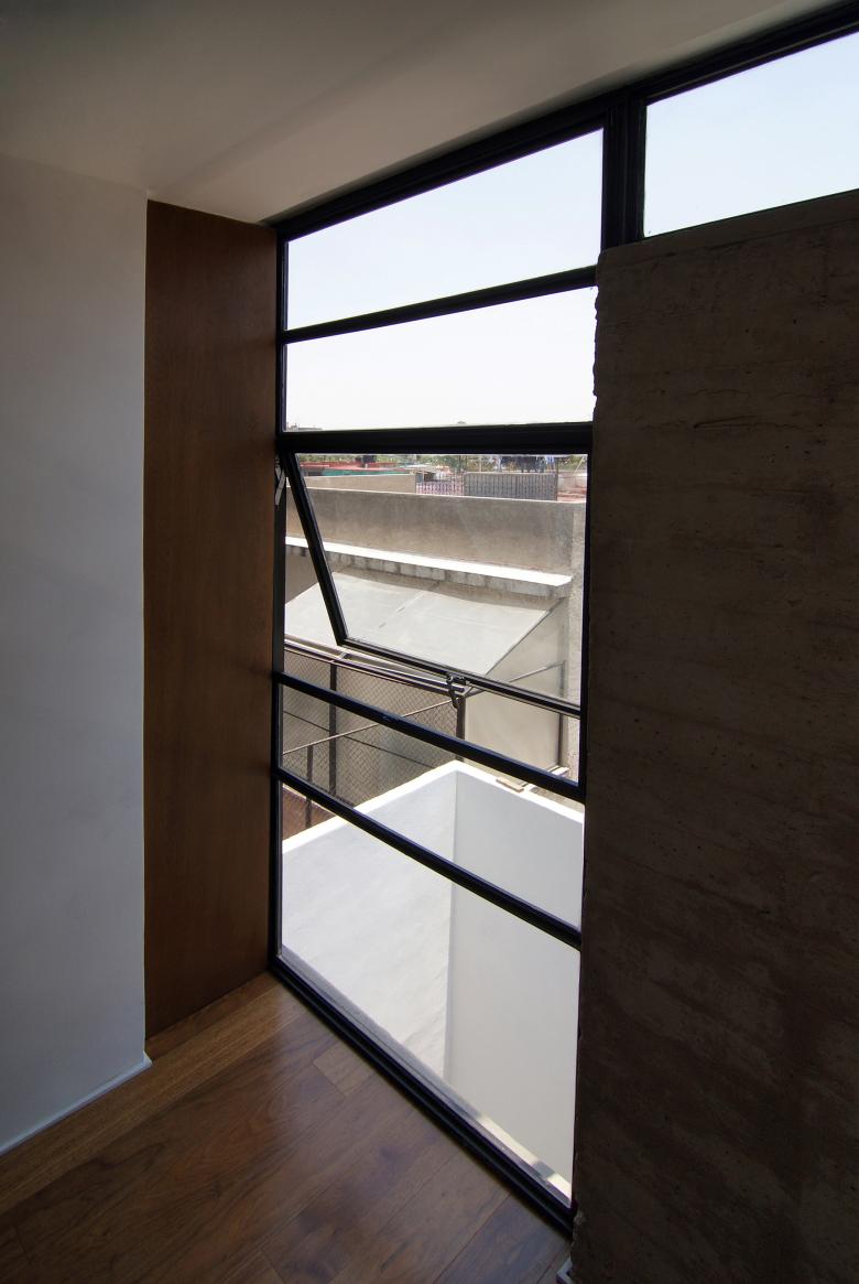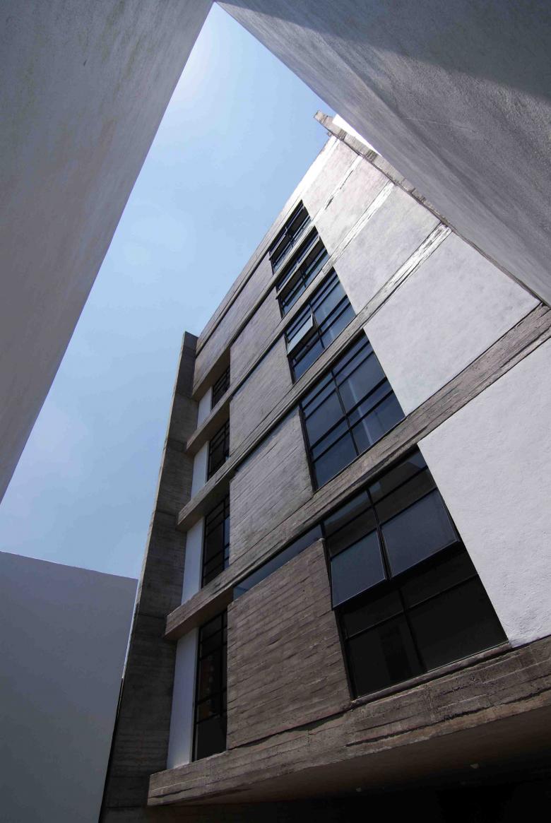 El edificio está conformado por cinco departamentos, uno por cada nivel. Dado el tamaño del terreno se opto por una estructura de concreto, solo 2 cartelas en las colindancias unidas por una losa de concreto reticular, por esta razon no hay columnas ni muros de carga en todo el edificio, lo que lo dota de una total flexibilidad en todos los espacios interiores. La mayoría de los materiales tanto de la estructura como de acabados, incluyendo los pisos de terrazo y la celosía de concreto, fueron hechos en sitio.