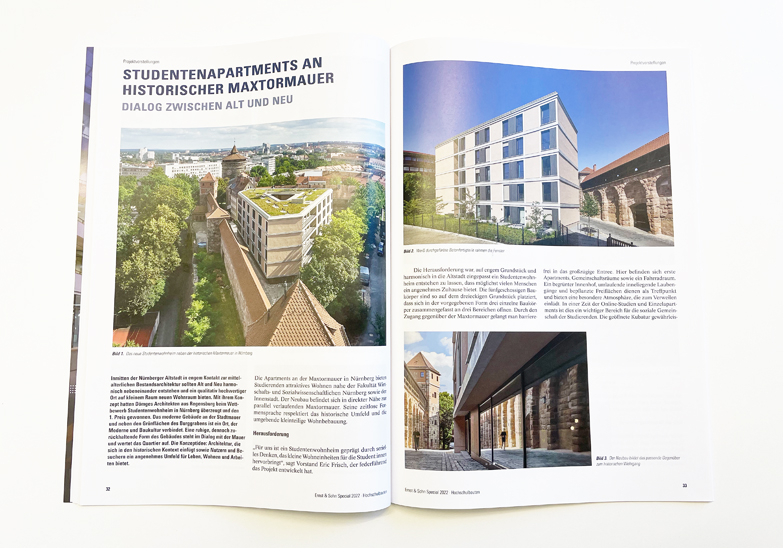 Im aktuellen Fachmagazin Schulen – Neubau, Umbau, Sanierung des Ernst & Sohn Verlags wird unser mit den Architektouren der Bayerischen Architektenkammer ausgezeichnetes Schulgebäude in Burglengenfeld vorgestellt. Dieser Erweiterungsbau bietet neue, moderne Räumlichkeiten für den Ganztagsbetrieb und ist vollständig in Holzbauweise mit einem Scheddach und Oberlichtern umgesetzt.