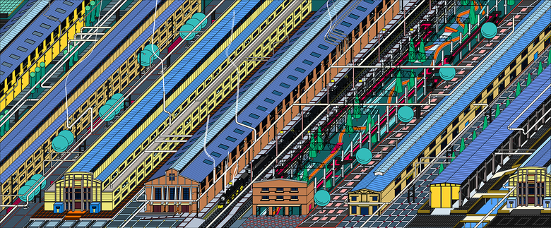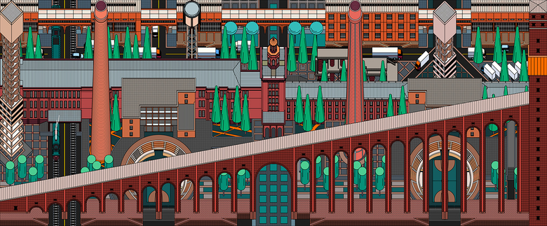 The second drawing Factory Structures depicts those iconic factory structures like chimney, water tower, covered bridge, and etc. which are some most impressive memories about factory.