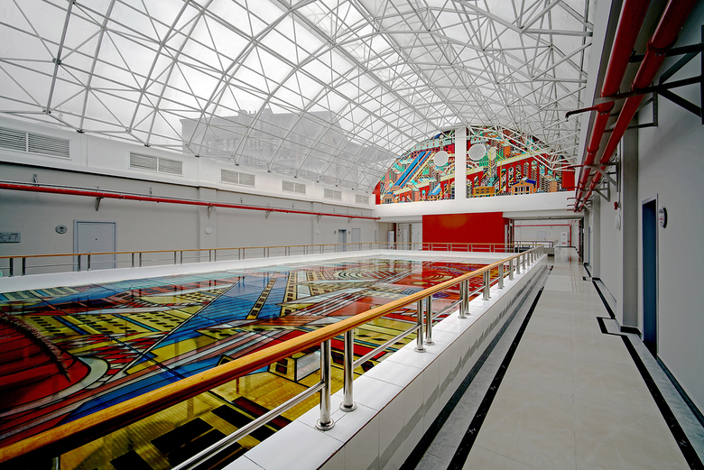 The largest surface inside the public space of the Party School is the glass roof of the atrium. With this largest surface, DAS uses the image to cover the glass roof, turning the regular glass into some “stained glass” with printed glass film.