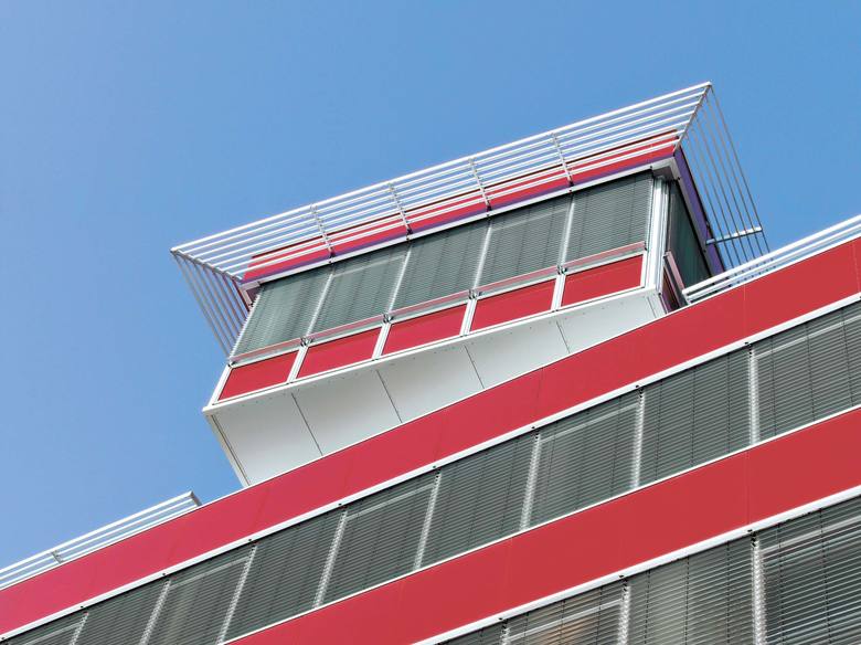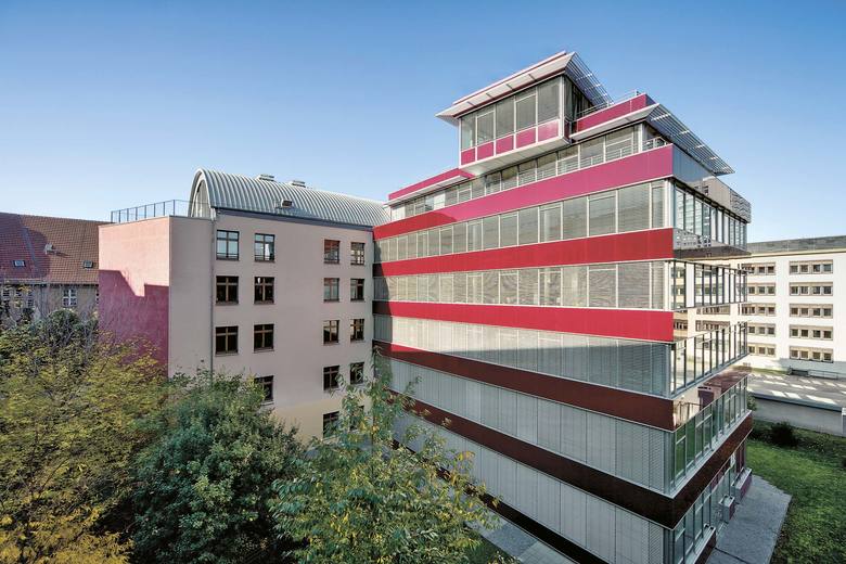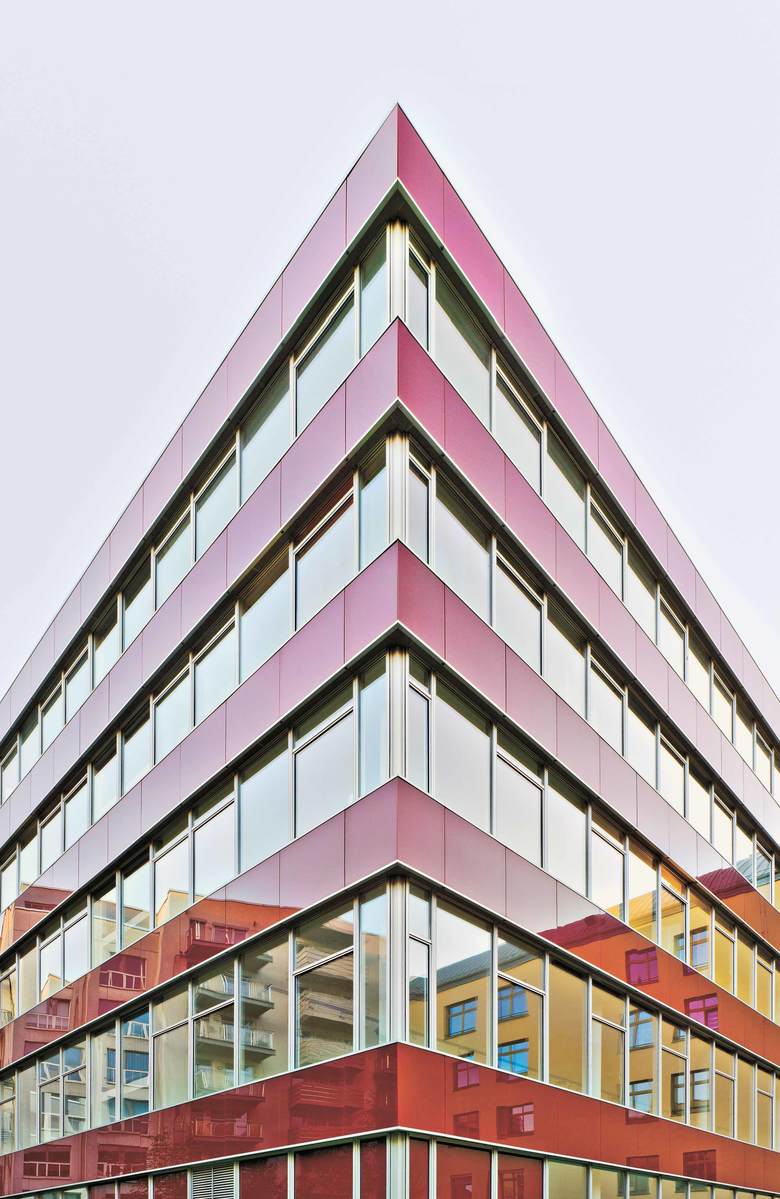 Gegenüber den drei alten Hinterhäusern steht in der Tiefe des Grundstücks ein kantiges Gebäude, dessen sieben Geschosse – fünf Normalgeschosse plus ein Staffelgeschoss plus ein kleines, nach Südosten kragendes Penthaus – reiner Neubau sind. Im Grunde ein schlichter Kasten, macht sich seine Architektur durch ihre drei Fassaden besonders. Beinahe knallrote Glastafeln laufen um sämtliche Geschosse, heben sich vom matten Aluminium der feinen Fensterrahmen und zarten Jalousien ab. Es ist, als ob hier das Beste aus dem Bürobau der 1960er-Jahre wieder belebt worden wäre.