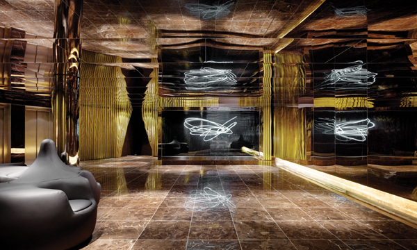 The lobby is a classical theatrical space. Togas wrap around walls creating screens that peel apart to expose lift entries. The bronze toned space is a box of infinite reflection with high gloss floors and mirror walls, a solitary neon light art installation creates a focal point. This is contemporary classicism.