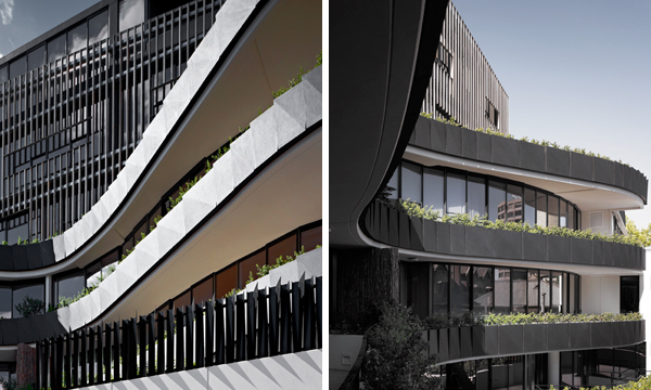 Moving up, the living is sandwiched in between the splines of the middle level’s façade, which wobble together in a Bezier curve and merge with the planters that tumble down and stretch up from each balcony, forming a canopy of life outside each apartment. The balconies are telescopic, which means the planters receive adequate sunlight and also drip rainfall onto the levels below. The upper levels are a timber cocoon, appearing as a separate building rising behind the lower levels.