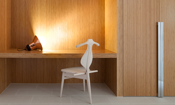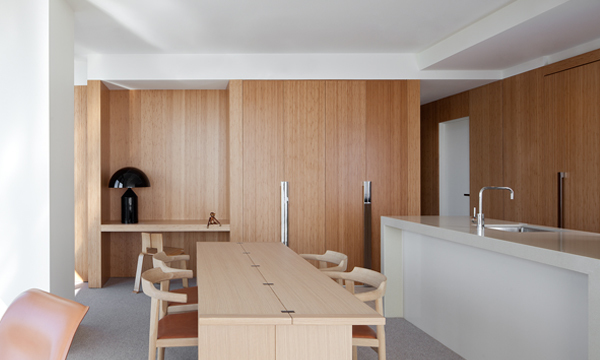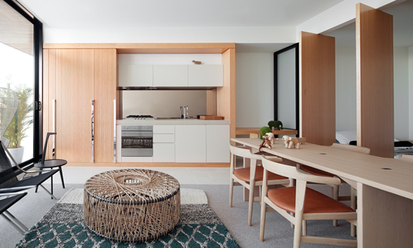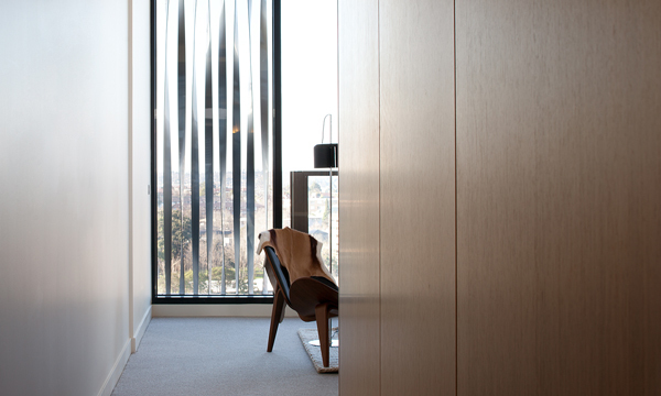 The lift lobby revisits the origins of architecture, with a collection of carpark mirrors arrange like shields on the walls, calling to mind the shields that adorned temple walls, another celebration of life through battle. This motif is also featured on the apartment entries, surrounded by wallpaper that fracatalises images of the landscape. The apartment interiors bring the outdoors in.