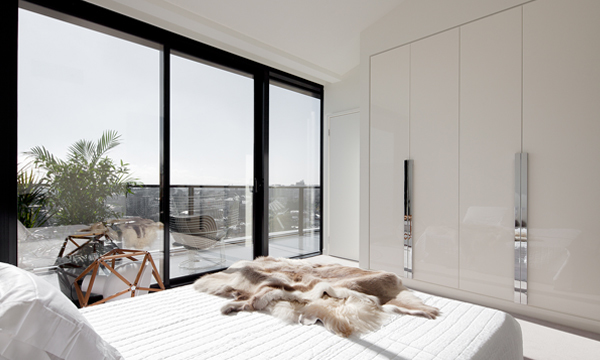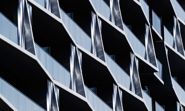 The upper levels of Clara are an architectural language of economy. Slipping in and out, a mere 500mm deep profiling of slab edge creates the balconies’ honeycomb effect, which, like a bee-hive, becomes the society of the building. This inhabitation is given another dimension by the twisting chrome screens that work their way up the height of the building, offering privacy to these outdoor spaces while mimicking the dappled shade that nature creates.