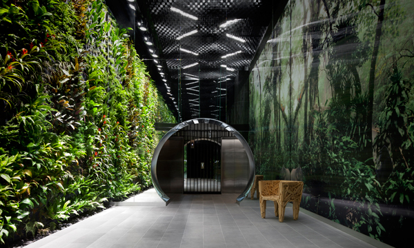 Walking into Clara, you’ll notice that the blurred line between building and environment continues with a vertical garden covering one wall. If you feel like someone is watching you, that’s normal: the other side of the lobby is covered in a lenticular wall, observing it in your peripheral vision it follows you, changing depending which way you look at it.