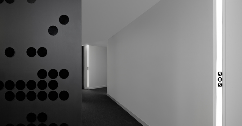 Besides the curvy form, revolutionary lighting system and flesh and bronze façade, Luna is also Elenberg Fraser’s first completed wayfinding and signage project for multi-residential apartments. A red Sith Lightsaber stands guard like a sentinel at Luna’s front entrance, and the red light carries through to the retail arcade directing you to the apartments above. White LED light battens are used in the lobby and throughout the ground floor; we created a dot-dash numbering system to identify the apartments.