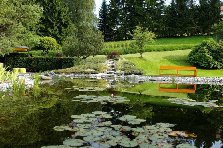 Die grossflächige Gartenanlage und die topographische Lage mit seinen Ebenen und Steigungen in einem Siedlungsbereich im Kanton Appenzell Innerrhoden zeichnen dieses Projekt aus. Eine der grössten Herausforderung bei der Realisierung dieses Gartens war die Einbindung der neuen Gestaltung in die bestehende Landschaft. Als raumbildende und schattenspendende Bäume im Bereich der grossen Holzterrasse wurden deshalb Pinus sylvestris gepflanzt, welche mit ihrer Art die alten bestehenden Föhren wieder aufnehmen. Im Bereich der Lounge bilden Eiben einen niedrigen Rahmen und Gräser geben der Landschaft eine weiche organische Form. Auf diese Art bilden der Garten und das Haus um den mit Seerosen geschmückten Teich eine harmonische Einheit.