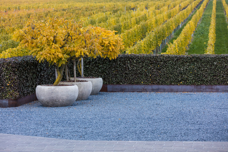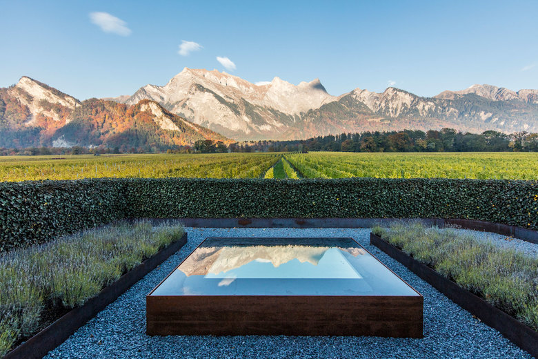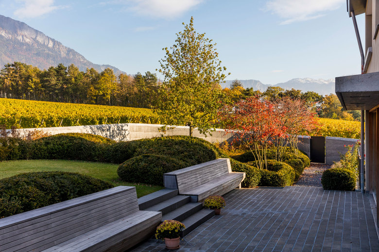 Zwischen Fläsch und Maienfeld befindet sich dieses wunderschön gelegene Weingut. Aufgabe der Planung war, sowohl den privaten Garten der Winzerfamilie zu gestalten, als auch die stark frequentierten Aussenanlagen des Weinguts. Das Herz der Anlage ist der Degustationsgarten mit den auf die Aromen der Weine abgestimmten Gewürze und Kräuter. Der angrenzende Familiengarten wurde so angelegt, dass das fantastische Panorama rundum einbezogen wird und sanft unterstreicht. Ruhige Eibenkissen in Kombination mit Amelanchiern prägen das Bild. Die für den Weinanbau und die Region typischen solitären Eichen markieren den Ort. Die intensive Abstimmung mit der ebenso zurückhaltenden wie beispielhaften Architektur wird dem Betrachter nur subtil vor Augen geführt.