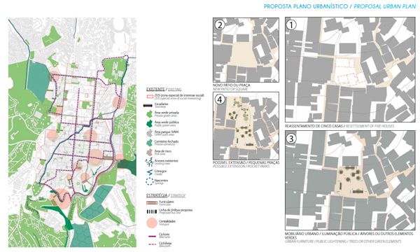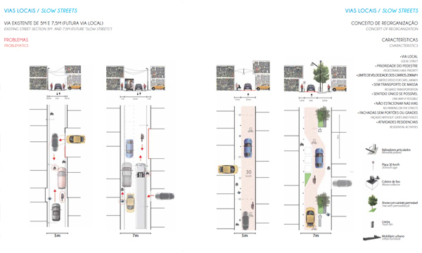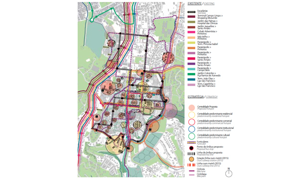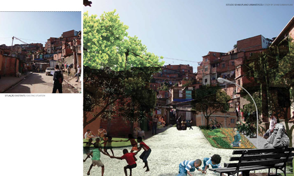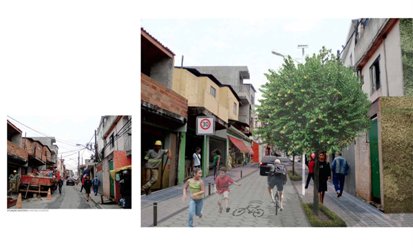 A different logic requires different tools: Sehab decided in 2011 to develop an urban plan for one of the most well known São Paulo’s precarious settlement named Paraisópolis, which since many years has received already numerous interventions by the public authorities. While Paraisópolis has got almost everything—schools, daycare-centers, walk-in clinics, social housing, spectacular public buildings by famous architects, banks, supermarkets, an almost completed basic infrastructure such as sewer, water supply and electricity, even a public park adjacent to the neighborhood is under construction—it lacks in street trees, in porous and green “breathing” areas, in infrastructure and facilities that favor pedestrians and cyclists in general but especially kids and elderly people. Additionally, the increasing amount of cars turns out to be one of the major challenges for the neighborhood. Private owned cars congest the narrow streets and interfere with the lively public activities. Considering the fact that the streets are almost the only existing open space in densely occupied neighborhood, this is particularly devastating. On the other hand, the existing orthogonal street grid that was implemented, regardless of the hilly topography, does not encourage using one’s own feet or a bike. Walks without any shelter from sun, rain and heat on steep streets, crowded by cars are often required to get from A to B. The densely occupied blocks, formed by the street grid prevent “short cuts” by foot or bike. As a consequence, the urban plan for Paraisópolis focuses on non-motorized transport systems; on a reorganized street hierarchy; on additional public transportation means such as aerial trams and funiculars; on the implementation of a network of green spaces, and on more green and permeable streets with street trees, rain gardens and flowerbeds. It is so to speak a “light” plan without major constructional intervention. The plan aims instead at interconnecting and bonding together, what has been constructed so far by the local community and the public authorities. Rather then the addition of new buildings, it suggests making free space and subtracting (bad) building fabric, where it is possible.
