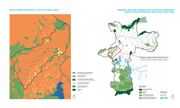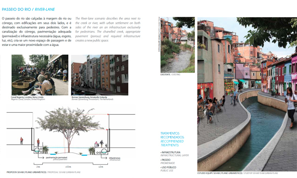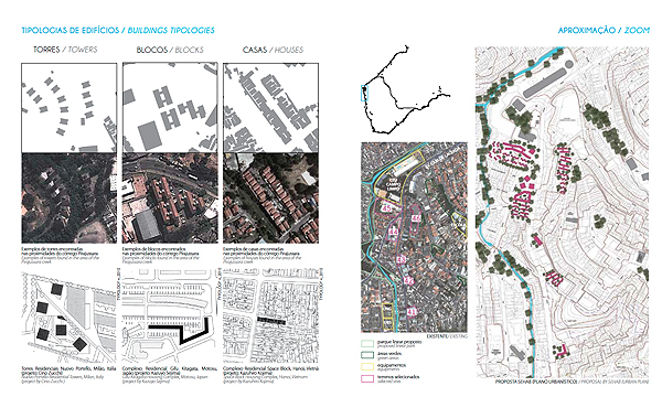 The Pirajussara creek emerges at the border between São Paulo and Embu, in the southwest of the metropolitan region with a total length of 19 kilometers. The creek defines at the same time the border between São Paulo and Taboão, another neighboring town of the metropolitan region with roughly 20 million inhabitants. The northeastern part of the Pirajussara basin is characterized by wealthy middle to upper middle class neighborhoods with well-equipped facilities, while the southwestern part is mainly defined by precarious settlements. Those concentrate especially along or on top of the creek along the arms of the latter. The area suffers from a serious lack of green and porous areas. The Pirajussara basin is home to roughly 1.2 million inhabitants. The southwester part, where most of the settlements are located, suffers furthermore from a serious lack in jobs and public transportation, which is obviously interrelated. This area is home to 420,000 people (or 119,795 families) but offers only 75,251 jobs. Only 17 percent of the people can therefore create an income in their immediate neighborhoods. 24 percent of the people commute daily long distances to their workplaces in São Paulo’s central parts. Impressive 59 percent of the people are unemployed. The urban plan suggests for the Pirajussara basin, and especially for the “forgotten part” of it, escaping from the classical problem-solution-approach. The urban planning strategy for the area recommends the implementation of the Pirajussara park, strongly linked to an ecological leisure network in order to create job opportunities for the local population. The proposed Pirajussara park connects with the large protected green areas in Embu, further to the west; with the subway final stop of the yellow line; with the newly implemented bike lane along the Pinheiros river, and to the Guarapiranga reservoir further to the south. The plan delivers a hands-on urban design tool box for the entire river, considering the current situations, and further a "density tool", promoting the densification on strategic locations.