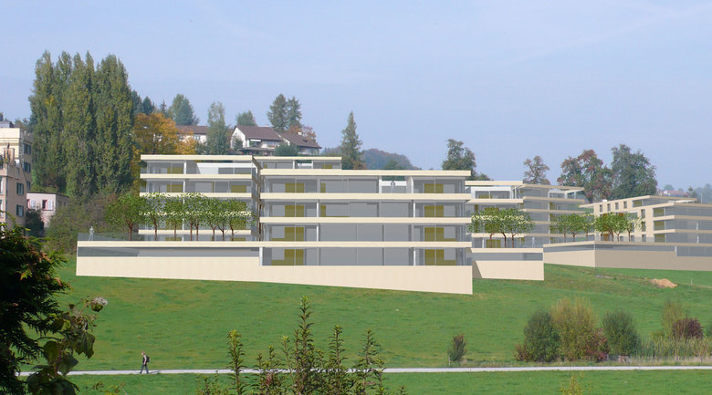 Mit unserem Projektvorschlag schlagen wir fünf grosse Wohnplattformen vor, die sich städtebaulich an der Typologie der bestehenden Wohnhöfe orientieren, sich in ihrer architektonischen Gestalt und Struktur aber eigenständig präsentieren. Im Gegensatz zur bestehenden Bebauung bilden die Wohninseln autonome, im Landschaftsraum frei angeordnete und gegenseitig auseinander driftende Ebenen. Mit dem leichten gegenseitigen Versetzen sowie der teilweisen Rotation der einzelnen Ebenen gelingt es für alle Häuser freie Sicht über das talseitig angrenzende Baufeld und optimale Besonnung sicherzustellen. Es entsteht ein offener, leicht und einladend wirkender Siedlungsteil, der trotz seiner Eigenständigkeit die beiden angrenzenden eher introvertierten Wohngebiete locker und eigenständig ergänzt und verbindet.