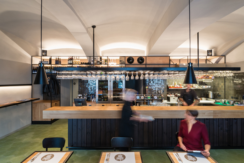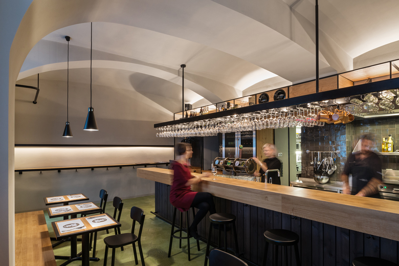Wertvolle Materialien – Markant ist die lange Schank, hinter der der Koch die Speisen live frisch zubereitet und sich dabei über die Schulter schauen lässt. Mittags wird an der Theke gegessen, abends diskutieren hier die BesucherInnen des nahen Akademietheaters und Konzerthauses ihre Eindrücke, oder flüchtige Bekannte kommen über das neue Draft Bier ins Reden. Freunde rücken an den paar Tischchen zusammen, verbunden durch eine lange Bank und genügend Hocker.