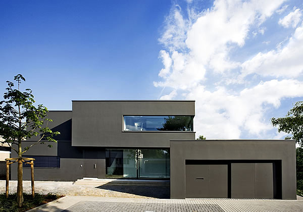 Außergewöhnlich war auch die farbliche Gestaltung der Fassade, die dunkel Anthrazit gleich den Aluminiumfenstern ist.