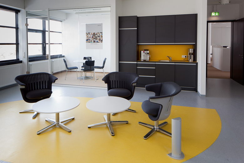 Zur Spree orientiert und signifikant, trägt die großzügig über sechs Geschosse verglaste Ostfassade besonders zur Identitätsbildung des Gebäudes bei. Darunter befindet sich die Kantine mit Außenterrasse direkt am Wasser.