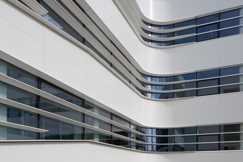 Die Größe des Gebäudes (105 m x 85 m) wird durch die Strukturierung, die Höhenstaffelung sowie die dynamischen Rundungen im Maßstab bewusst verändert.