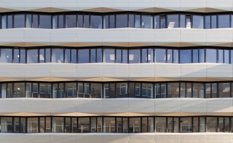 Das Bestandsgebäude nimmt die Büroflächen auf, während für die Laborbereiche ein siebengeschossiger Neubau errichtet wurde. Im fünften Obergeschoss sind die Gebäude über einen transparenten Verbindungsgang direkt miteinander verknüpft.