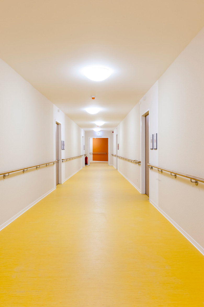Demgegenüber arbeitet das Haus im Inneren stark mit Farben, Licht und warmen Materialtönen, um den Bewohnern ein angenehmes, inspirierendes und Orientierung gebendes aber auch sehr wohnliches Umfeld zu schaffen.