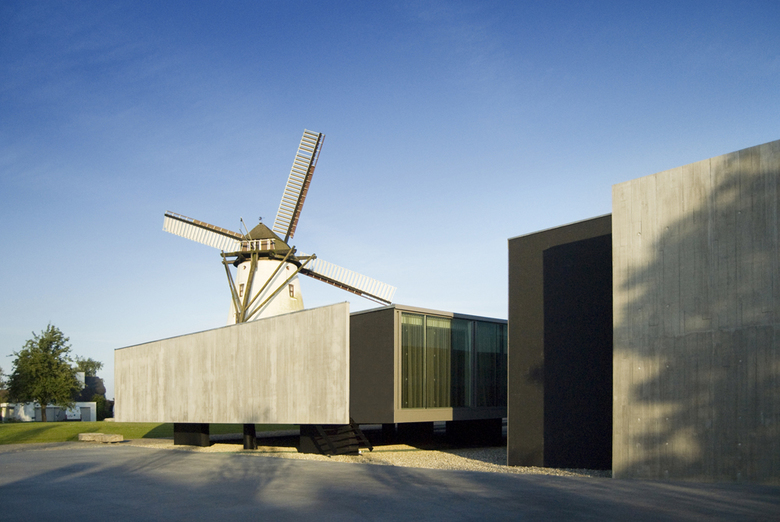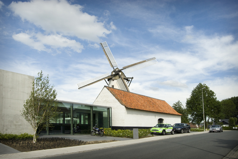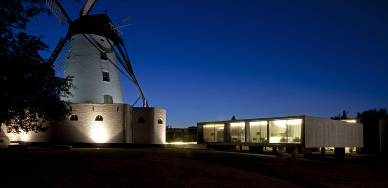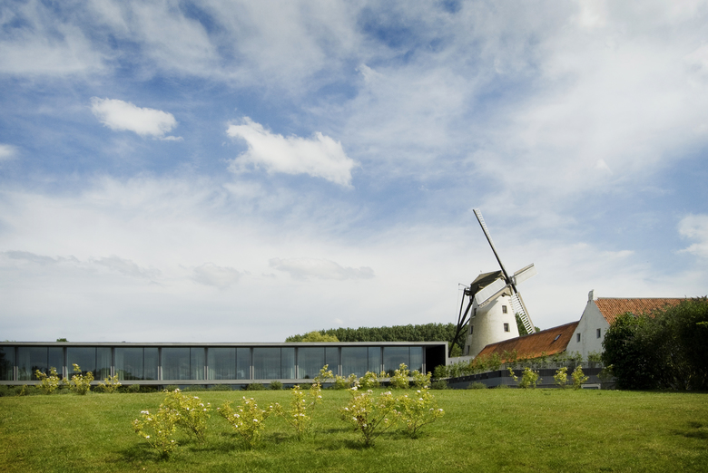 Extension and reconversion of an existing farm and mill site into a hotel – A formation of four concrete volumes gathers around a U-shaped farm building and a protected and renovated windmill. The old and new entities have no direct contact above the surface, though underground, there is a tunnel underneath the old farm, forming the base of the concept. Starting from the hotel reception to the south, the tunnel disappears under the inner square through a contemporary glass volume.