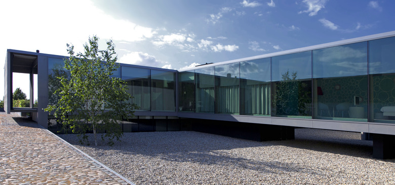 To the north, three entirely new volumes are visually separated from the mill and farm. Only a tunnel connects these volumes with the reception zone. The zone in between both entities above ground level is defined by an old cobblestone road that lays aside the farm, and leads us towards the landscape. 45 rooms, 34 standard & 11 suites along with an art gallery are dispersed in these northern volumes.