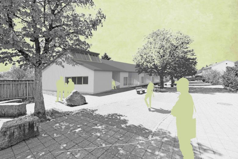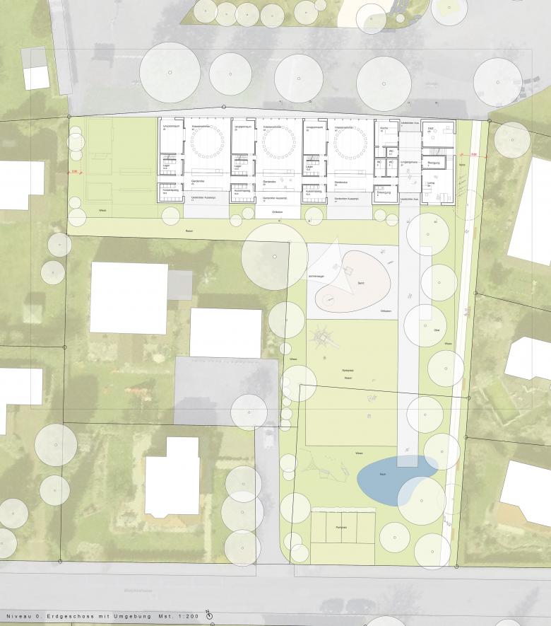 Projektwettbewerb für den Neubau eines dreifachen Kindergartens südlich zum Schulzentrum Kreuzfeld angrenzend an die "Bleichestrasse". Der neue Kindergarten orientiert sich in seiner Ausrichtung und Volumetrie an den bestehenden Bauten der Schulanlage und begrenzt den bestehenden Pausenplatz.