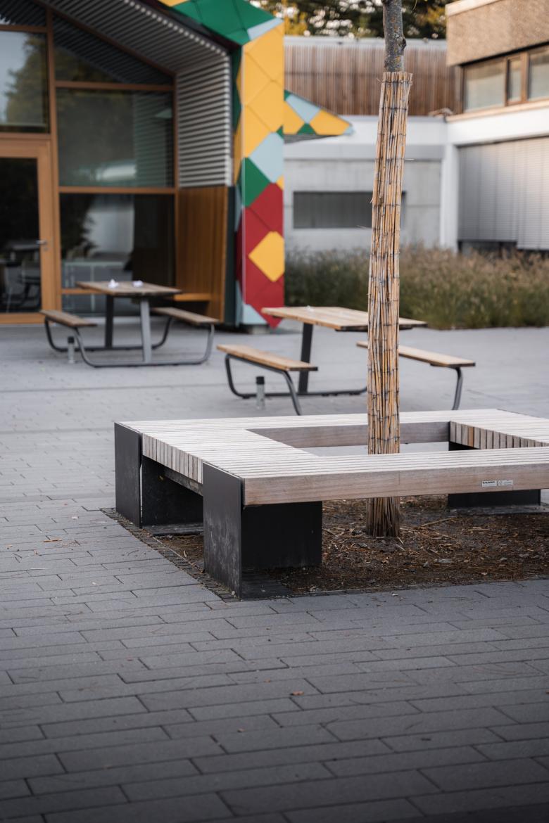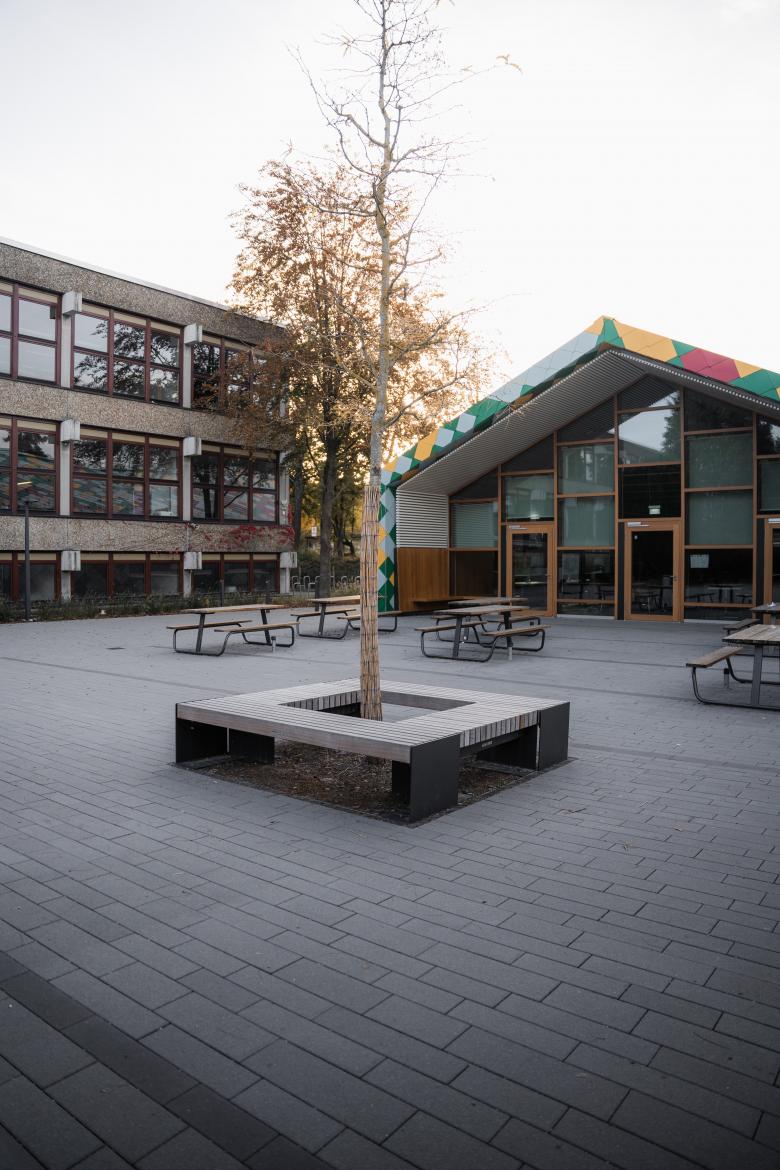 Der neue Hauptzugang für die Schüler wurde etwas nach Süden verlegt und von einer ansprechenden Gräserpflanzung gerahmt. Er führt in den zentralen Schulhof, wo der Außenbereich der Mensa über Intarsien im Belag hervorgehoben wird. Hier ist der neue Hauptaufenthaltsbereich des Schulhofs entstanden. Funktionale Bereiche, wie Parkplatz, Fahrradstellplätze und Anlieferung sind über gesonderte Zufahrten zugänglich und unterscheiden sich vom zentralen Schulhof über einen Wechsel des Belages. Die