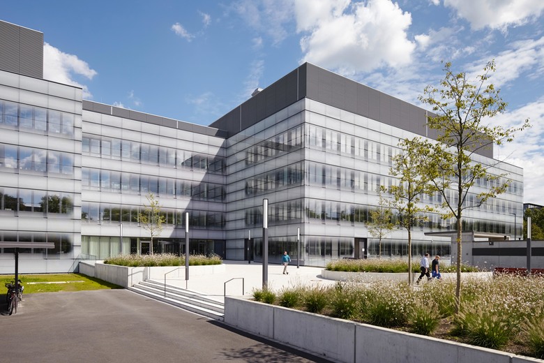 Der Neubau des Forschungs- und Entwicklungszentrums liegt an der Schnittstelle zur landwirtschaftlich geprägten Auenlandschaft des Mains und zum Naturschutzgebiet Schwanheimer Düne.