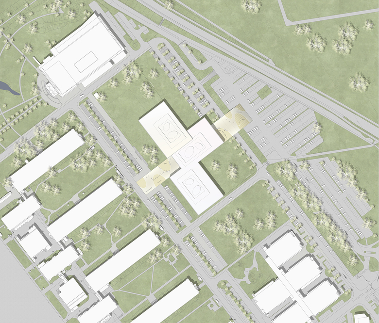 In einladender Geste schiebt sich das Rückgrat des Komplexes, die „Magistrale”, in die Landschaft hinaus und bildet das repräsentative Tor des Industrieparks Hoechst. Vom Parkplatz aus kommend wird der Besucher über eine langgezogene Rampe zum Eingangsportal geleitet. Die Magistrale setzt sich in Form eines durchgehenden Belags in der Foyerzone des Forschungszentrums fort und erstreckt sich bis auf die Südseite des Gebäudes, wo sie einen großzügigen Eingangsbereich für die Mitarbeiter formuliert. Durch locker eingestreute Baumgruppen und Pflanzinseln wird der parkähnliche Charakter der südwestlich angrenzenden Grünflächen aufgegriffen und ein Bezug zur Landschaft außerhalb des Industrieparks hergestellt. Anlehnend an den Corporate-Gedanken des Unternehmens entsteht eine offene und einladende Atmosphäre, die Clariant ein neues Gesicht und eine repräsentative Adresse verschafft.