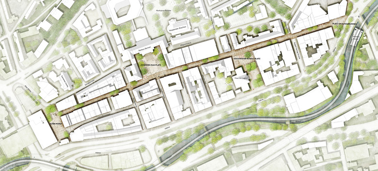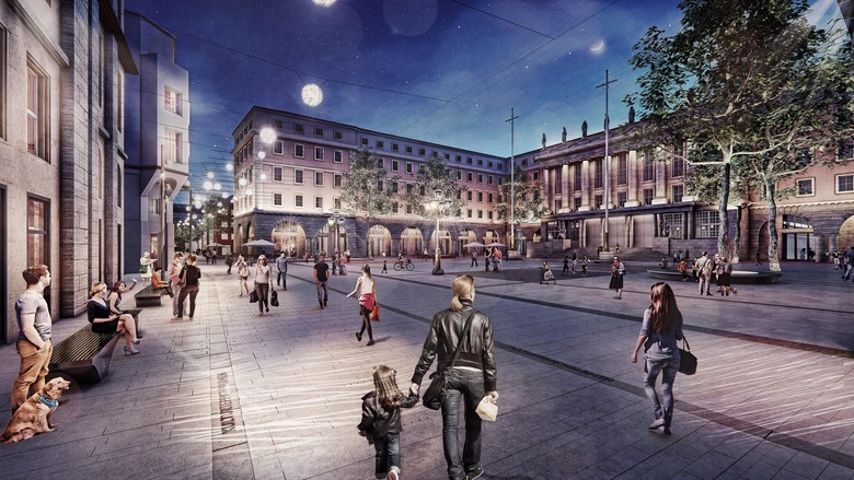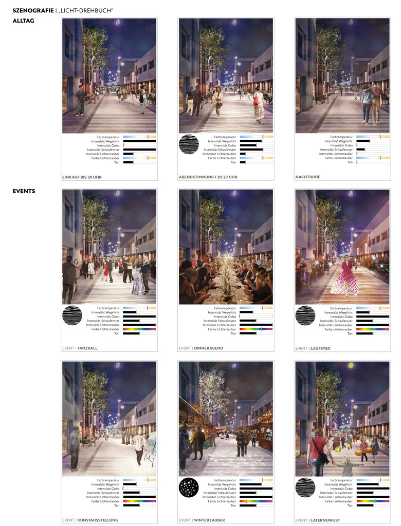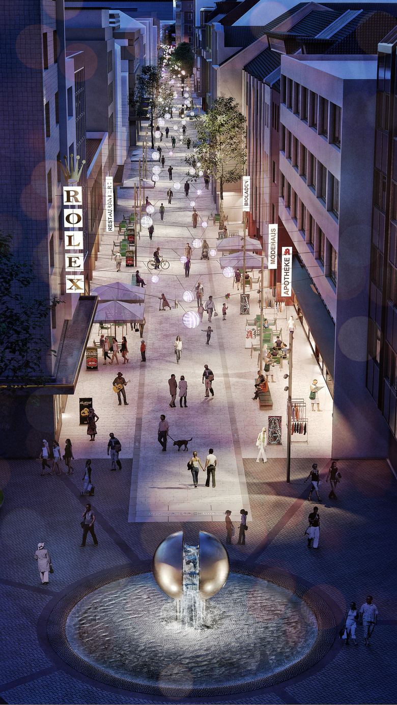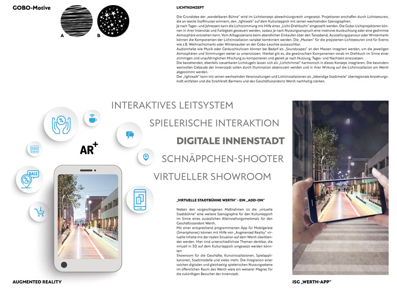 In unserem Gestaltungskonzept interpretieren wir die Barmer Innenstadt als „Urbanes Theater“, dessen Stadträume in Form von unterschiedlichen „Szenographien“ abwechslungsreich programmiert und bespielt werden können. Der „Alte Markt“ und der „Platz an der Werther Brücke“ bilden dabei die Haupteingänge und „Foyers“. Der „Johannes-Rau-Platz“ und der „Geschwister-Scholl-Platz“ sind als „große und kleine Bühne“ die urbanen Spots für Märkte, Feste und Veranstaltungen. Der Werth bildet als „Laufsteg“ das verbindende, lineare Rückgrat innerhalb dieser spannungsreichen Platzfolge. Die Querstraßen des Werth werden durch die punktuellen „Satelliten“ angebunden, die die „Nebeneingänge“ zur Innenstadt markieren. Das Besondere an unserer Idee: Durch computergesteuerte Lichtprojektoren soll der steinerne Kulturteppich und die Fußgängerzone durch ein komponiertes “Lichtdrehbuch” je nach Nutzung und Tageszeit in ganz unterschiedliche Atmosphären getaucht werden. Die Innenstadt wird zum “urbanen Theater” mit vielfältigen Szenographien.