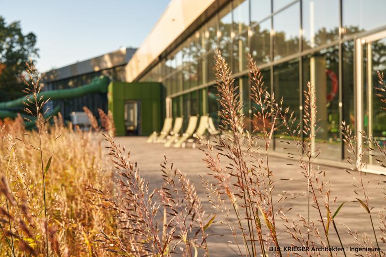 Durch den Eingang gelangen die Besucher:innen in das Gebäude mit Hallenbad, welches das urbane, belebte Zentrum des Areals bildet. Dieses wird durch eine klare und lineare Gestaltung charakterisiert. Das Freiraumkonzept sieht eine allmähliche Transformation dieser Urbanität in eine ruhige, natürlich anmutende Landschaft mit einer geschwungenen Formsprache vor. Ein weiteres prägendes Gestaltungsmerkmal ergibt sich aus der Topographie des Geländes. Die unterschiedlichen Höhen des Freiraums werden in Form von Ebenen sichtbar gemacht und durch Böschungen akzentuiert. Die Ebenen dienen gleichzeitig als Grundlage für die Aufteilung der verschiedenen Nutzungen, wie die Außenterrassen, die Schwimmbecken, der Aktivbereich, das Kinderschwimmbecken, der Wasserspielplatz und der Sandspielplatz.