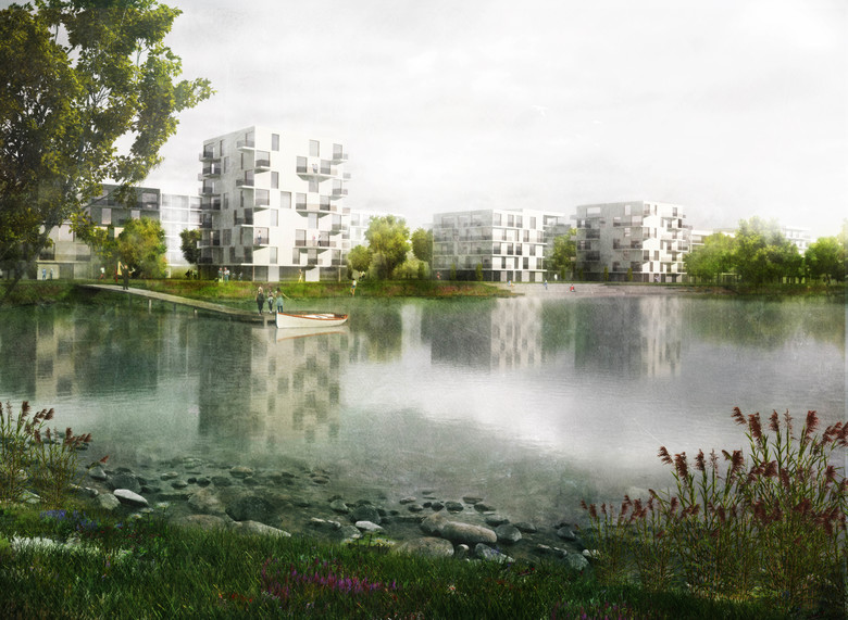 Unser Grundkonzept sieht eine attraktive Verbindung zwischen den neu entstehenden Gebäuden und den vorhandenen Natur- und Erholungsräumen vor. Die schollenartig und polygonal geformten Flächen bieten unterschiedlichen Nutzergruppen und Generationen abwechslungsreiche Kommunikations- und Verweilorte sowie Bewegungsmöglichkeiten an. Der wertvolle Baumbestand wird weitgehend erhalten. Durch gezielte und notwendige Auslichtungen sowie einiger Neupflanzungen wird eine Offenheit und Durchlässigkeit erreicht und der parkartige Charakter gestärkt. Die Sichtachsen, die den Charakter des Quartiers maßgeblich prägen, stellen einen Bezug zwischen den Wohngebäuden, dem differenzierten Grünraum und dem See her. Durch die gezielte Platzierung der Neubauten erhalten möglichst viele Wohnungen Ausblicke auf den Albertussee.