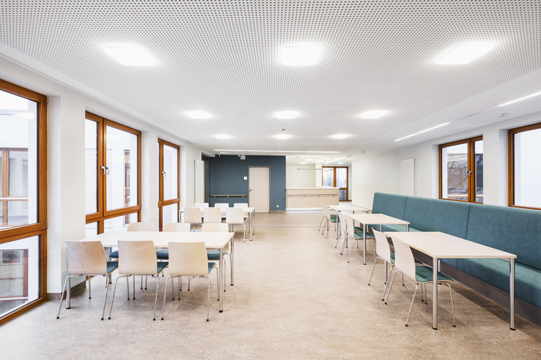 Im Zentrum der beiden Stationen liegen die "Marktplätze", unterteilt in Küche, Essbereich, Lounge und Schwesternstützpunkt. In den großzügig angelegten Rückzugsräumen können die Patienten lesen, fernsehen oder miteinander reden. Weitere Aufenthaltsbereiche bieten die geschützten Innenhöfe. Weitläufige Strukturen und viel Tageslicht prägen die Architektur der neuen Einrichtung.