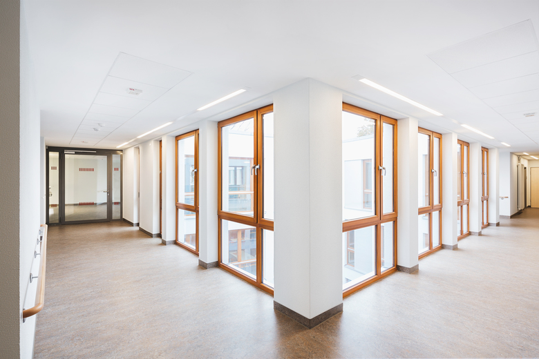 Die Innenarchitektur mit ihrem Farb- und Materialkonzept sorgt für eine wohnliche Atmosphäre und eine klare Orientierung. Die Materialoberflächen sind pflegeleicht und können bei Bedarf schnell ausgebessert werden.