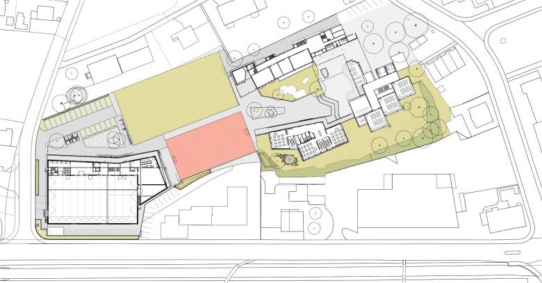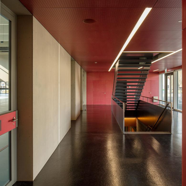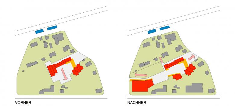 Der Bauplatz liegt im trapezförmigen Geviert, das als Ortsmitte und Schwerpunkt des öffentlichen Dorflebens fungiert. Der Abbruch der alten Schulturnhalle bildet die Voraussetzung für das städtebauliche Konzept des Erweiterungsprojekts: Der Schulhof öffnet sich neu nach Westen zu einem grosszügigen und attraktiven Freiraum, welcher sich bis zur neuen Mehrzweckhalle erstreckt. Der Schulneubau schirmt den Pausenplatz südlich gegen die Immissionen der Tösstalstrasse ab und bildet zusammen mit den Altbauten ein neues Ensemble rund um den zentralen Pausenplatz. Die Mehrzweckhalle fügt sich in die Verlängerung der Eingangs-fassade der Schulerweiterung ein und besetzt als markanter Eckstein die prominente Parzellenecke bei der Einfahrt ins Zentrumsgebiet. Die beiden Neubauten bilden durch ihre räumlichen Bezüge und ihre einladenden Laubengänge eine architektonische Einheit. Die Mehrzweckhalle wird als Holzelementbau mit verputzter Hülle ausgeführt und bezieht sich durch Massstab und Materialisierung auf die regionstypischen Industriebauten, welche die Tösstalstrasse säumen. Die dorfseitigen Laubengänge werden als leichte Holz-strukturen ausgeführt und verleihen dem Vorplatz eine freundliche Atmosphäre.