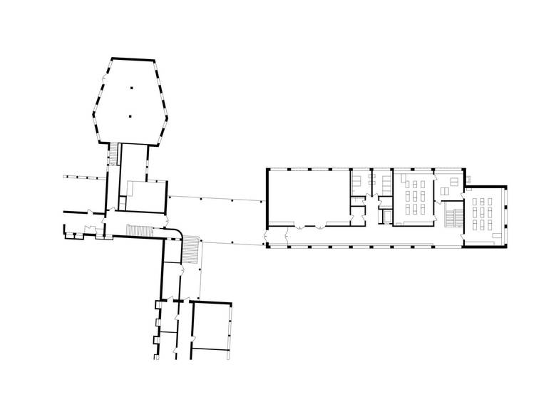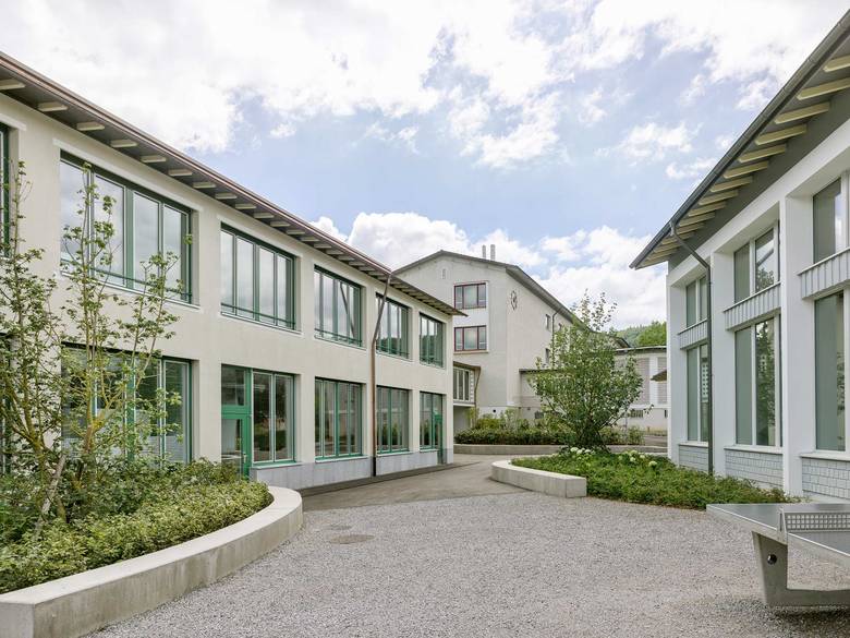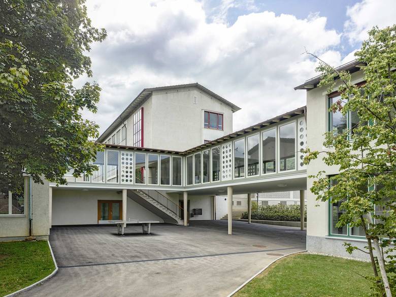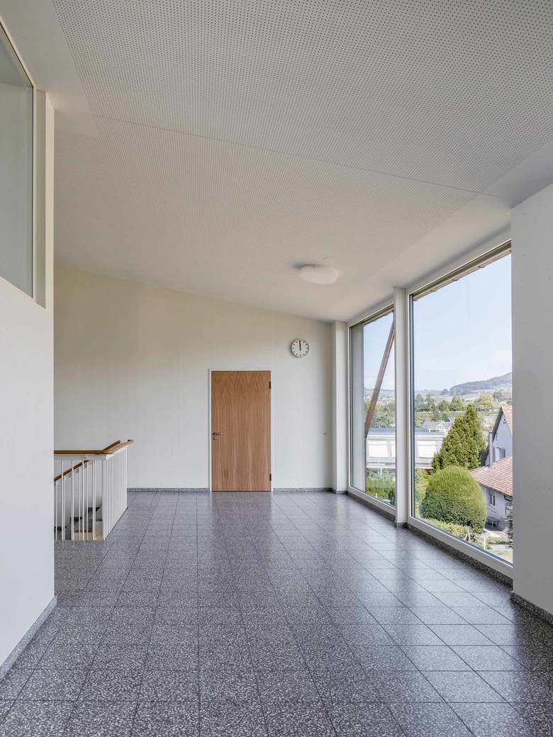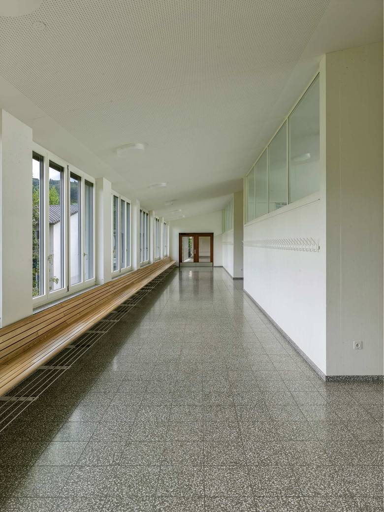 Die Grundrisstypologie des zweigeschossigen Gebäudes entwickelt sich aus dem Bestand heraus. Pro Stockwerk sind jeweils vier Schulzimmer entlang eines breiten Korridors angeordnet. Zwischen den Schulzimmern eingefügte Gruppenräume brechen den Korridor auf und eröffnen spannende Querbezüge. Mittels des überhohen Erdgeschosses und der gefalteten Dachfigur werden so alle Räume optimal belichtet.