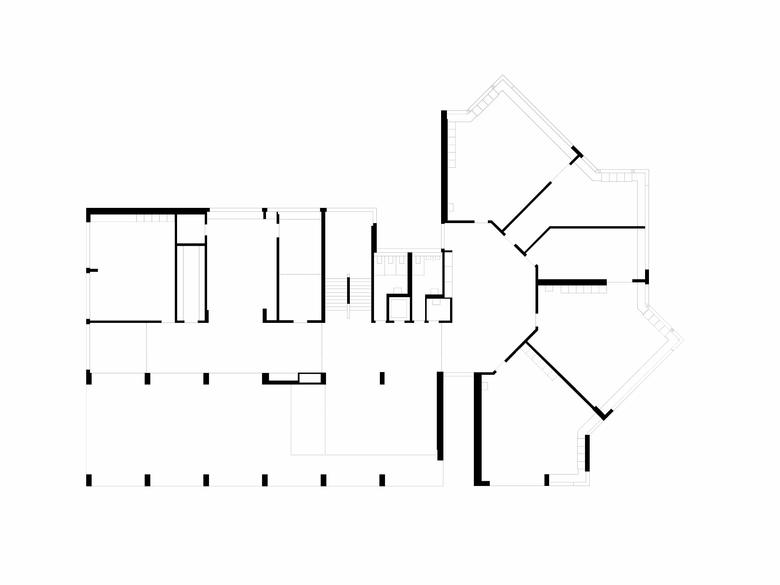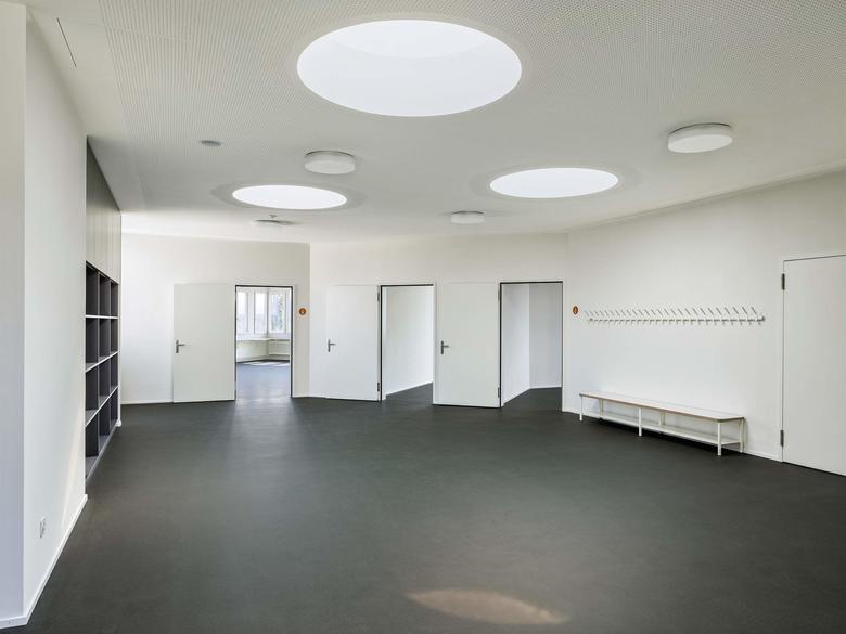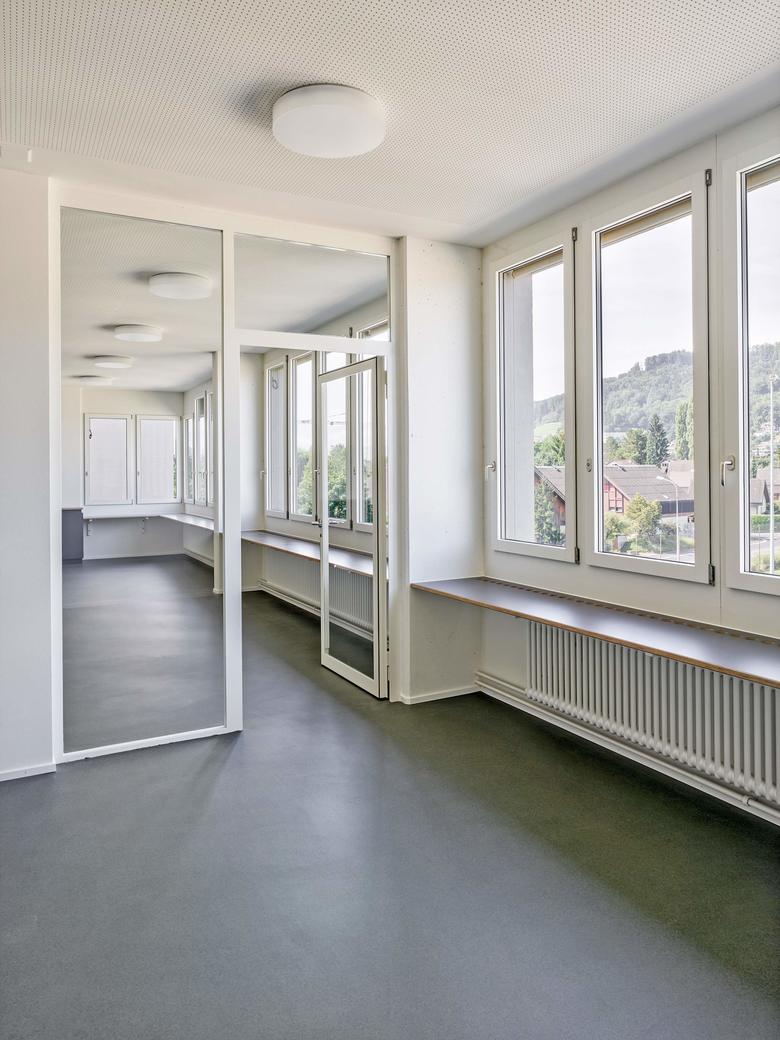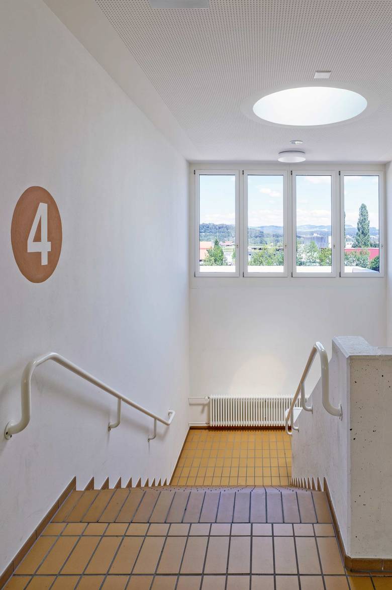 Der Ansatz des Weiterbauens ist auch im Innern konsequent fortgeführt. Die Aufstockung übernimmt die bestehende sternförmige Organisation der Unterrichtsräume. Neben dieser Erweiterung um sechs Klassenzimmer ist zusätzlich im Untergeschoss eine neue Tagesschule eingefügt worden. Die nötigen Anpassungen in der Fassade, um genügend Tageslicht zu erhalten, fügen sich dezent ein.