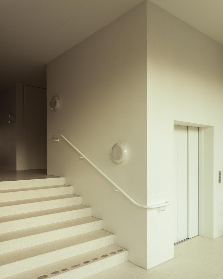 Clusterartige Raumorganisation – Das neue Schulhaus ist clusterartig organisiert. Auf beiden Geschossen sind jeweils fünf zweiseitig orientierte Unterrichtseinheiten untergebracht. Im Erdgeschoss befinden sich die Kindergärten und die Tagessschule mit direktem Aussenbezug. Die fünf Raumeinheiten sind über den aareseitigen Freiraum direkt von aussen zugänglich und intern über Türen verbunden. Das zentrale Treppenhaus erschliesst über den Haupteingang und den aareseitigen Korridor die Schulzimmer im Obergeschoss. Die Schul- und Reserveräume wenden sich bewusst zur ruhigen Pausenhofseite hin. Auch hier sind die Haupträume mit Türen direkt miteinander verbunden, was klassenübergreifende Unterrichtsformen ermöglicht.