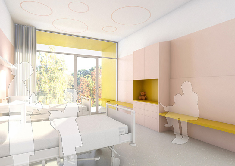 Der Entwurf basiert auf dem spielerischen Thema des „Baukastens“, das auf mehreren Ebenen und mit einem homogenen Farbkanon Anwendung findet. Die farbig gestalteten kastenförmigen Loggien bilden einen Sichtschutz für die Patienten bei gleichzeitig attraktiven Ausblicken. Die Kastenstruktur wird in der Querspange fortgesetzt, die sich aus locker gestapelten, gegeneinander versetzten Kuben formt.