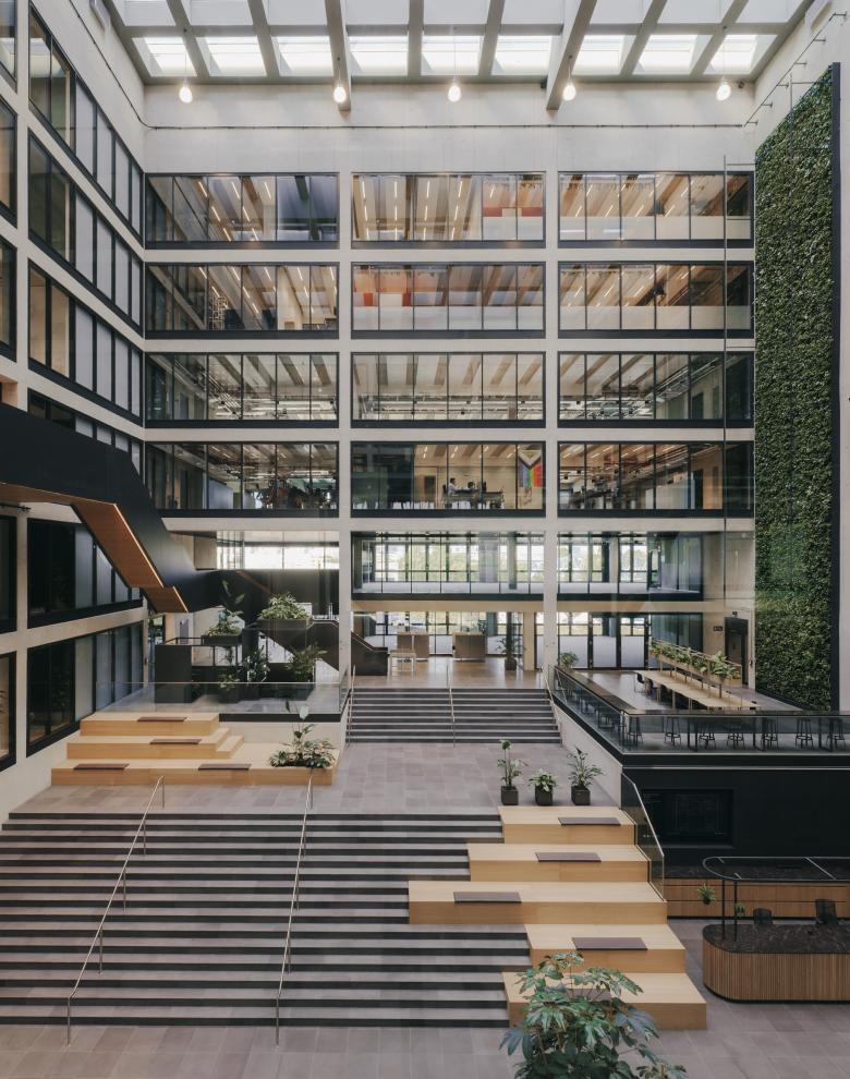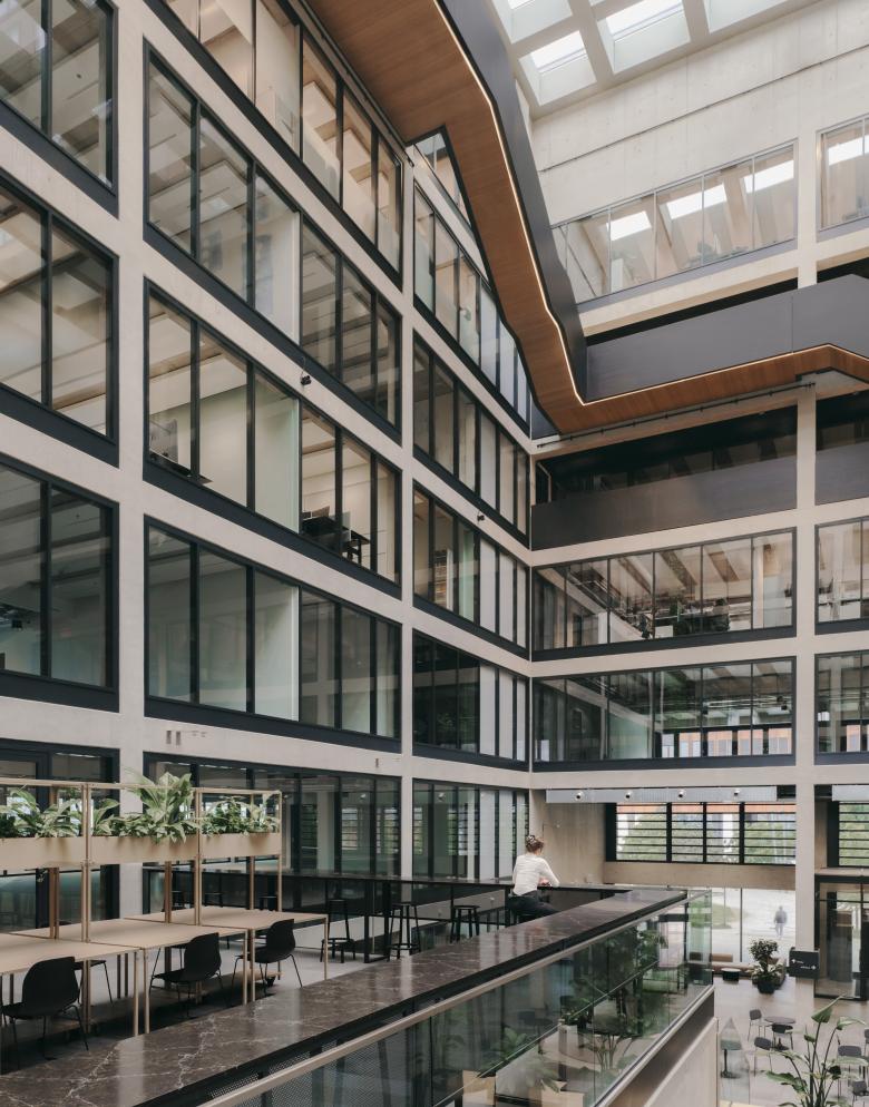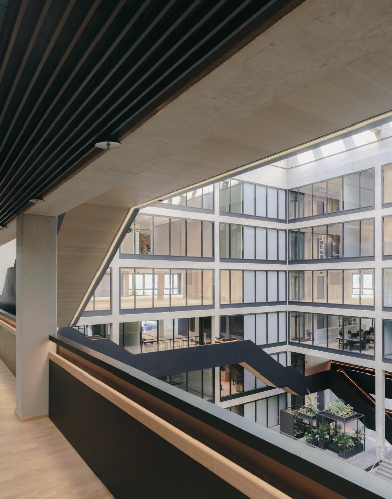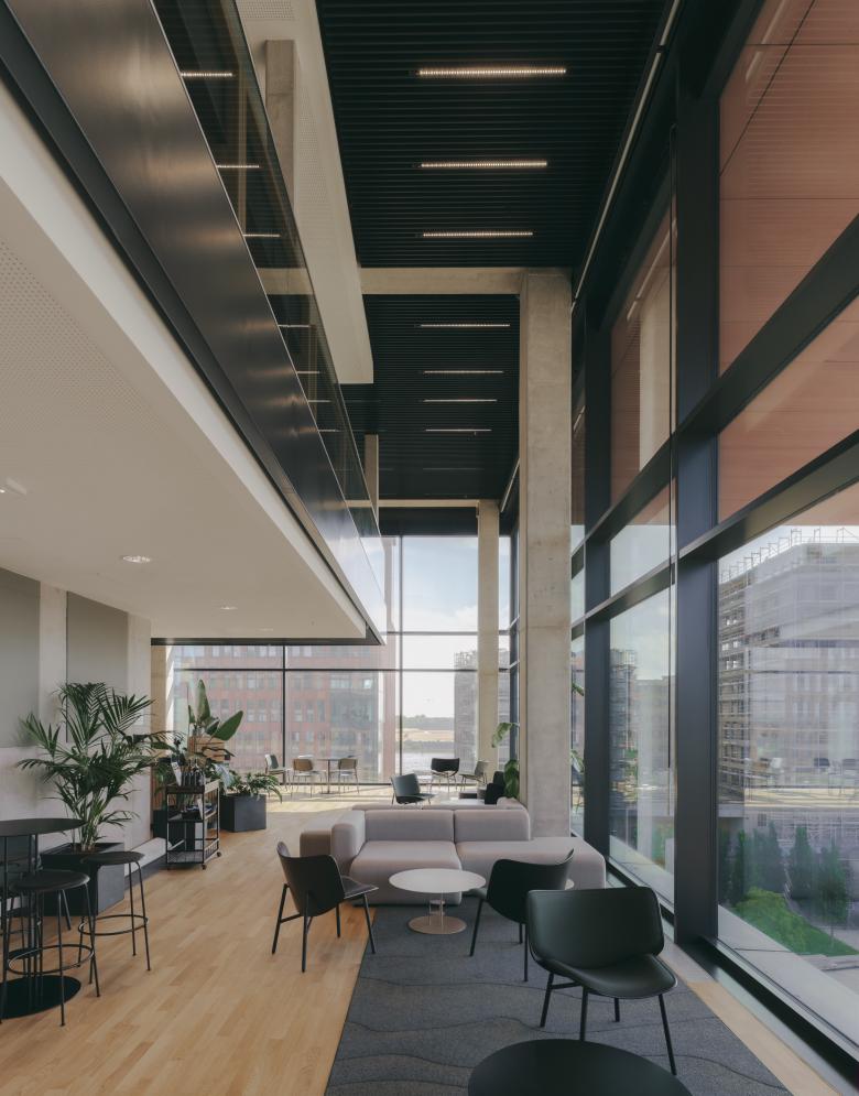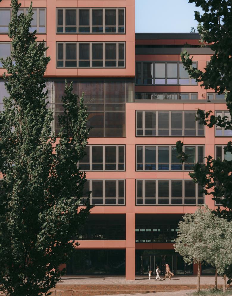 Im Westen der Hamburger HafenCity entwickelt sich aus ehemals industriell genutzten Hafenflächen ein vielfältiges neues Stadtviertel für Wohnen, Arbeiten und Freizeit. Mit dem EDGE HafenCity ist im Elbbrückenquartier nun ein weiterer wichtiger Baustein entstanden. Das energieeffizient geplante Bürogebäude fördert aktiv Interaktion und Kollaboration: Es bringt nicht nur die Menschen zusammen, die hier arbeiten, es öffnet sich auch Gästen und Menschen aus der Nachbarschaft. Der Neubau setzt sich aus zwei Gebäudeteilen zusammen – einem siebengeschossigen quadratischen Baukörper und einem Turm, der diesen mit einer Gesamthöhe von knapp 60 Metern im Südwesten überragt. Mit seinem quadratischen Gebäuderaster lässt sich das in einzelne Büroeinheiten unterteilte Gebäude flexibel nutzen. Zweigeschossige Arkaden und eine stützenfreie acht Meter weite Auskragung markieren den Haupteingang des Gebäudes am Amerigo- Vespucci-Platz. Kommunikatives Herzstück des Neubaus bildet ein zentrales Atrium, das auch für Gäste öffentlich zugänglich ist. Eine offene Treppe windet sich spiralförmig um den zentralen Luftraum und verbindet alle Geschosse miteinander. Auf jeder Ebene entstehen an der Treppe terrassenförmige Plateaus. Der Neubau schreibt so die Gestaltung des umgebenden Platzes mit Treppen und Terrassen im Inneren fort. Das Gebäude ist wie eine kleine Stadt konzipiert, die Raum für Begegnungen und Austausch, gemeinsame Lunch- und Kaffeepausen sowie individuelle Entspannung schafft. Im Erdgeschoss befinden sich Gastronomie- und Konferenzbereiche, in den Obergeschossen die mietbaren Büroflächen mit Zonen für kollaboratives und konzentriertes Arbeiten. Sie stehen allen Mieter*innen als gemeinsame Aufenthaltsbereiche zur Verfügung. Ebenso die umlaufende, üppig bepflanzte Dachterrasse, die der Erholung dient. Über das Atrium und die großformatigen Fenster fällt reichlich Tageslicht in die Innenräume. Es sorgt gemeinsam mit Pflanzen, natürlichen Materialien und vernetzten digitalen Technologien für eine komfortable Atmosphäre – zum Arbeiten und für ein soziales Miteinander. So wie sich das EDGE HafenCity mit seinem offenen und vielfältigen Konzept mit dem sozialen Umfeld vernetzt, fügt sich seine rote Fassade visuell in das städtebauliche Gefüge der östlichen HafenCity ein. Alle Dachflächen des Gebäudes sind als Retentionsdächer ausgebildet und größtenteils intensiv begrünt. Das Turmdach ist mit Photovoltaik-Paneelen zur Stromversorgung ausgestattet. Mit dem EDGE HafenCity ist ein Bürogebäude entstanden, das mit seiner innovativen Arbeitswelt Kollaboration und Kreativität fördert, und zu einem aktiven Baustein des sozialen Gefüges im neuen Elbbrückenquartier wird.