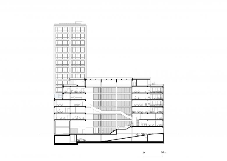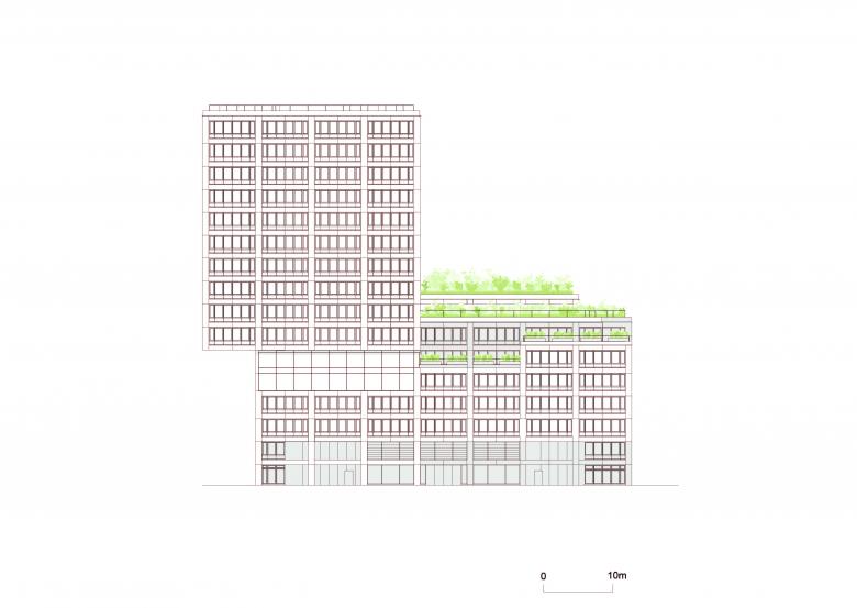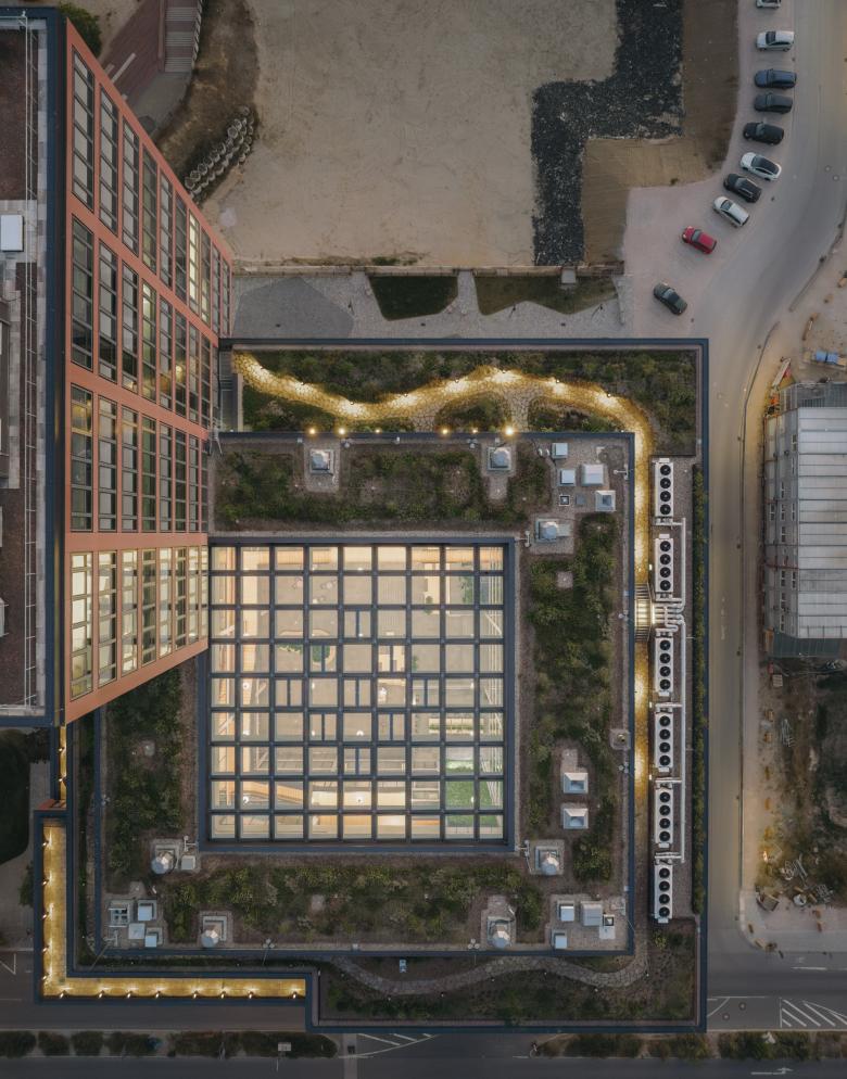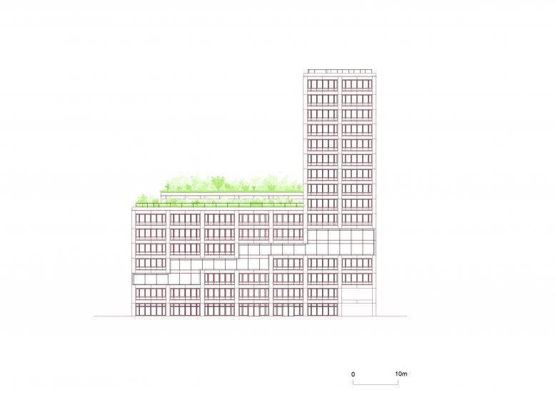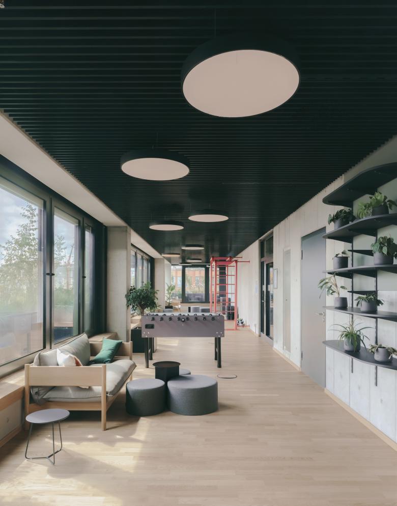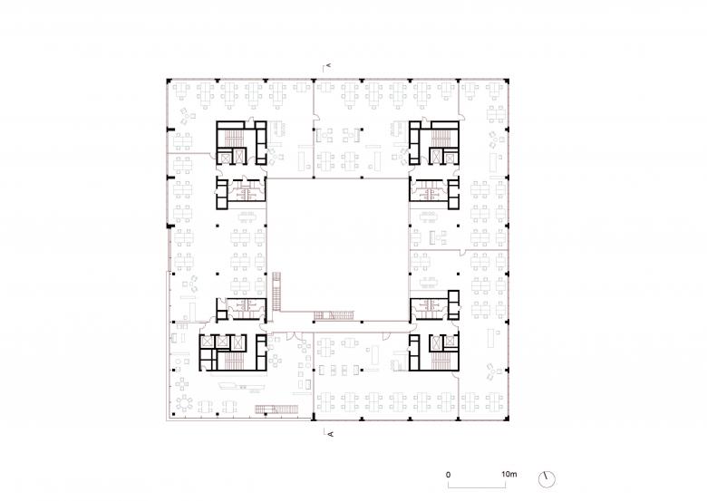 Im Westen der Hamburger HafenCity entwickelt sich aus ehemals industriell genutzten Hafenflächen ein vielfältiges neues Stadtviertel für Wohnen, Arbeiten und Freizeit. Mit dem EDGE HafenCity ist im Elbbrückenquartier nun ein weiterer wichtiger Baustein entstanden. Das energieeffizient geplante Bürogebäude fördert aktiv Interaktion und Kollaboration: Es bringt nicht nur die Menschen zusammen, die hier arbeiten, es öffnet sich auch Gästen und Menschen aus der Nachbarschaft. Der Neubau setzt sich aus zwei Gebäudeteilen zusammen – einem siebengeschossigen quadratischen Baukörper und einem Turm, der diesen mit einer Gesamthöhe von knapp 60 Metern im Südwesten überragt. Mit seinem quadratischen Gebäuderaster lässt sich das in einzelne Büroeinheiten unterteilte Gebäude flexibel nutzen. Zweigeschossige Arkaden und eine stützenfreie acht Meter weite Auskragung markieren den Haupteingang des Gebäudes am Amerigo- Vespucci-Platz. Kommunikatives Herzstück des Neubaus bildet ein zentrales Atrium, das auch für Gäste öffentlich zugänglich ist. Eine offene Treppe windet sich spiralförmig um den zentralen Luftraum und verbindet alle Geschosse miteinander. Auf jeder Ebene entstehen an der Treppe terrassenförmige Plateaus. Der Neubau schreibt so die Gestaltung des umgebenden Platzes mit Treppen und Terrassen im Inneren fort. Das Gebäude ist wie eine kleine Stadt konzipiert, die Raum für Begegnungen und Austausch, gemeinsame Lunch- und Kaffeepausen sowie individuelle Entspannung schafft. Im Erdgeschoss befinden sich Gastronomie- und Konferenzbereiche, in den Obergeschossen die mietbaren Büroflächen mit Zonen für kollaboratives und konzentriertes Arbeiten. Sie stehen allen Mieter*innen als gemeinsame Aufenthaltsbereiche zur Verfügung. Ebenso die umlaufende, üppig bepflanzte Dachterrasse, die der Erholung dient. Über das Atrium und die großformatigen Fenster fällt reichlich Tageslicht in die Innenräume. Es sorgt gemeinsam mit Pflanzen, natürlichen Materialien und vernetzten digitalen Technologien für eine komfortable Atmosphäre – zum Arbeiten und für ein soziales Miteinander. So wie sich das EDGE HafenCity mit seinem offenen und vielfältigen Konzept mit dem sozialen Umfeld vernetzt, fügt sich seine rote Fassade visuell in das städtebauliche Gefüge der östlichen HafenCity ein. Alle Dachflächen des Gebäudes sind als Retentionsdächer ausgebildet und größtenteils intensiv begrünt. Das Turmdach ist mit Photovoltaik-Paneelen zur Stromversorgung ausgestattet. Mit dem EDGE HafenCity ist ein Bürogebäude entstanden, das mit seiner innovativen Arbeitswelt Kollaboration und Kreativität fördert, und zu einem aktiven Baustein des sozialen Gefüges im neuen Elbbrückenquartier wird.
