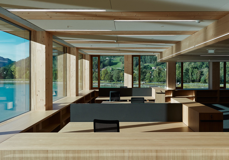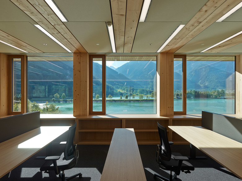 Eine Besonderheit des Systems ist, dass das Holz nicht nur trägt, sondern auch sichtbar bleibt. Denn das Material verschwindet nicht wie sonst üblich hinter Gipswänden – es bildet einen Teil des Innenausbaus. Damit lassen sich Bauten im industriellen Maßstab mit der gleichen Sorgfalt und Wohnlichkeit herstellen wie die kleinen Preziosen, für die das Vorarlberg sonst berühmt ist.