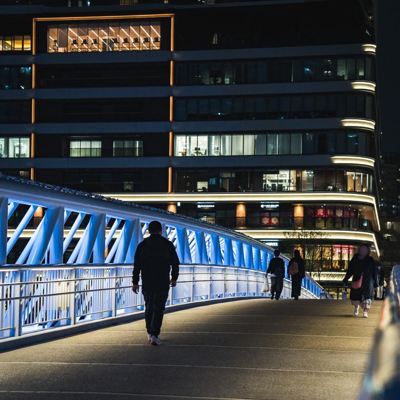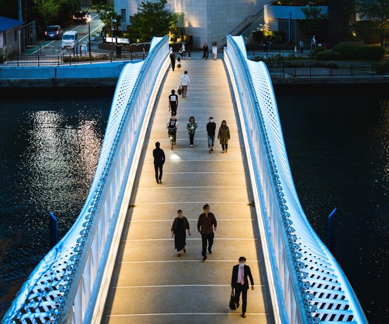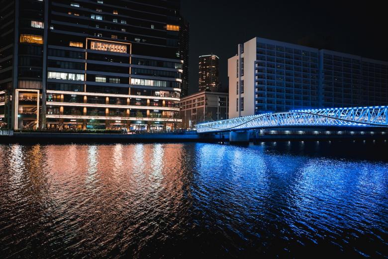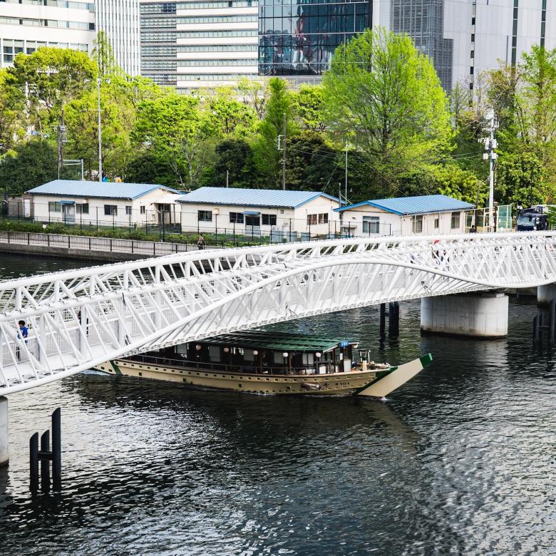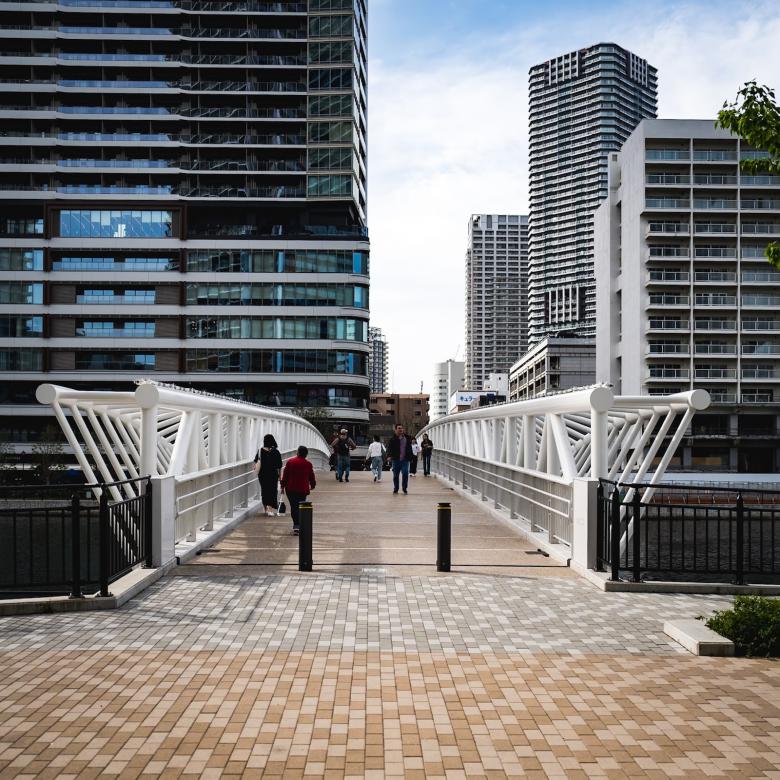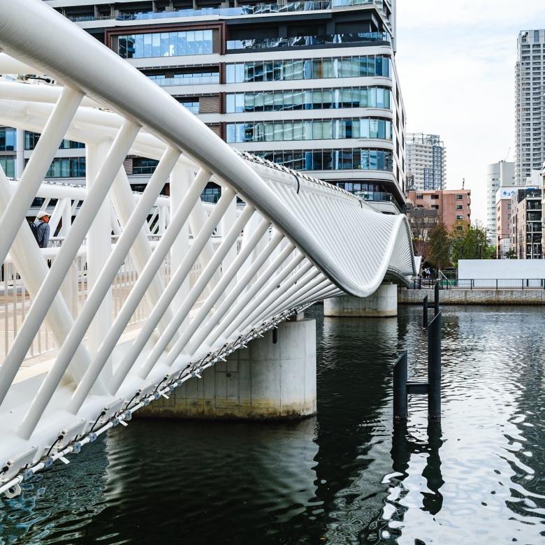 朝潮運河をまたぎ、GRAND MARINA TOKYOへとつなぐ「黎明小橋」は、水面に波打つような柔らかい曲線のデザインが、おだやかな波のイメージを表現している。