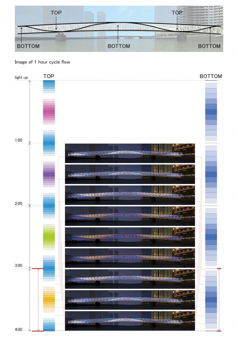 三次元的に形状が波打っているその上下で照明プログラミングのリズムを変えることで上下の色の組み合わせの違いが様々な表情を生み出すように工夫した。それによってこの新しく開発が進み住む人が増えるこのエリアの夜の風景を、毎日見るたびにその一瞬の組み合わせや動きが楽しめるものとした。