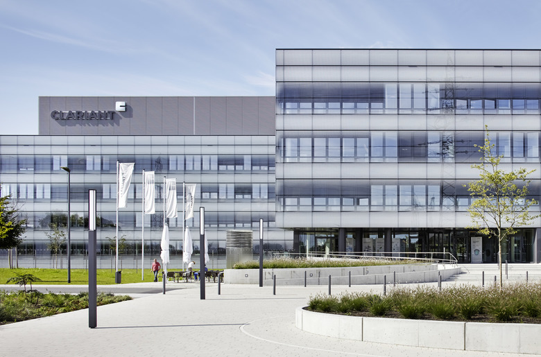 In der landschaftlich geprägten Umgebung zeigt sich die weiße, durchgehend bedruckte Glasfassade, mit fließenden Übergängen von opak bis transparent, als charakteristisch und elegant. Zudem spiegelt diese Gebäudehülle die Kompetenzen Clariants - Innovation, Forschung und Entwicklung - wider. Auf vier Etagen im Inneren des Gebäudes ist dem Wunsch des Bauherren nach Austausch und Begegnung der 500 Mitarbeiter entsprochen worden. Die Büro- und Laborbereiche an den Fassadenseiten sowie die zentral gelegenen, ellipsenförmigen Atrien mit Kommunikationsinseln sorgen für eine kommunikative Arbeitswelt und ermöglichen durch die offene Raumstruktur vertikale und horizontale Blickbezüge.