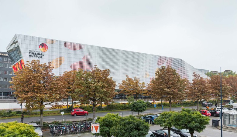 Dass es sich um den Ort des beliebtesten deutschen Sports handelt, kommuniziert auch die Fassade des Neubaus. Das Thema Fußball wird über eine perforierte, LED-hinterleuchtete Leichtmetallfassade abgebildet: Die rechteckigen Stanzungen verdichten sich zum Motiv des klassischen Fußballs. Der Fassadenzwischenraum wird durch austauschbare Bannergrafiken bespielt. An der Stirnseite vervollständigt eine LED-Medienfassade die erlebnisorientierte Außenwirkung des Bauwerks.