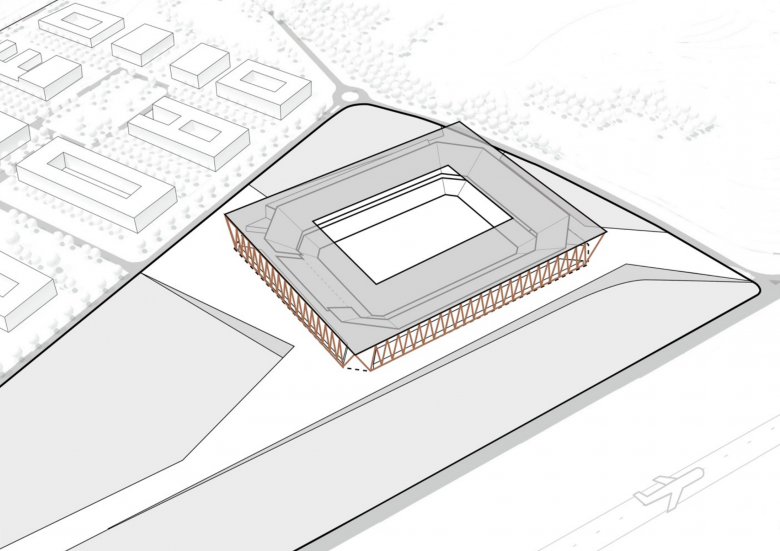Der Baukörper fügt sich mit seiner konsequenten und zeitlosen Eleganz in die sanfte Topografie am Wolfswinkel im Westen Freiburgs ein. Durch die unmittelbare Nähe zum Flughafen und die damit einhergehende Höhenlimitierung ist eine flache orthogonale Dachgeometrie entstanden. Die außen liegenden diagonalen Zugstäbe geben dem Stadion seinen unverwechselbaren Charakter. Im Zusammenspiel mit der achteckigen Grundform des Stadioninnenraums ergeben sich die Hauptzugänge an den Ecken und es entsteht ein dynamisches und identitätsstiftendes Erscheinungsbild. Durch die leicht erhabene Lage auf einer Anhöhe entsteht das Motiv eines Pilgerortes – das Stadion wird zum Blickfang und Anziehungspunkt.