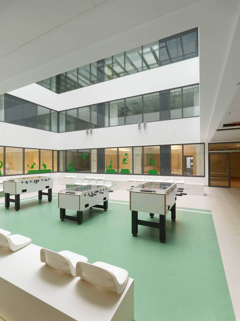 HPP-Projektpartner Volker Biermann erläutert: „Wir haben großen Wert auf den menschlichen Maßstab gelegt. Helle, freundliche Räume, eine gute Orientierung, hohe Funktionalität und die Robustheit des Gebäudes tragen dazu bei. Die Architektur wird bereichert durch die kunstvolle Version der neuen Arche, die illustrierten Wände und Glasflächen sowie die künstlerische Gestaltung der Innenhöfe.“