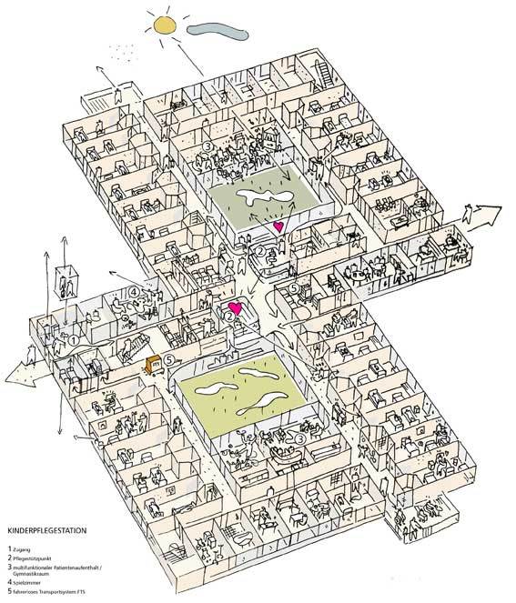 Die als quadratische Pavillonbauten angelegten Patientenbereiche liegen auf einem gemeinsamen, mehrgeschossigen Funktionsbau. Die Sockelgeschosse beherbergen die funktionalen Bereiche wie Empfang, Notaufnahme, Untersuchungsräume, Operationssäle, Labore, Physiotherapie, Personalräume und Konferenzbereiche. Über eine Magistrale in den drei Funktionsgeschossen werden die einzelnen Pavillons erschlossen. Ein Vorteil dieses Prinzips ist insbesondere die durch die Lichthöfe ermöglichte natürliche Belichtung.