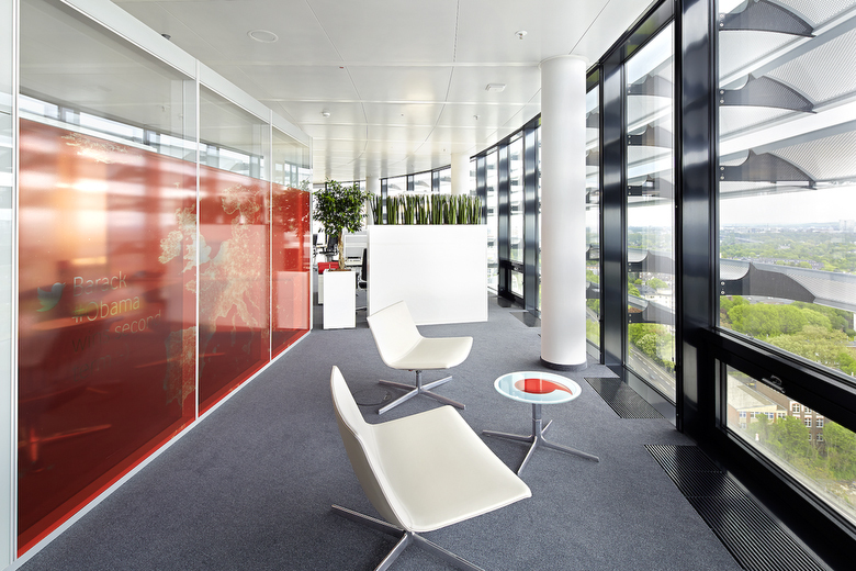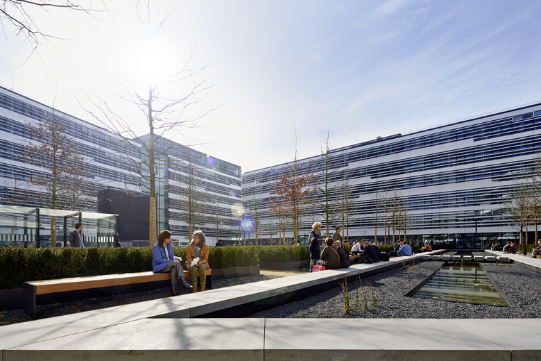In Verbindung mit dem angrenzenden, radial gebogenen Gebäuderiegel folgt das 19-stöckige Hochhaus dem Verlauf der nahe gelegenen Schnellstraße und bildet das Rückgrat des Ensembles. Das prägende Merkmal sind die horizontal gegliederten Fassaden mit außen liegenden, unterschiedlich ausgerichteten Verschattungselementen aus weißen, gelochten Aluminiumblechen, die als Ausdruck der Corporate Identity des Unternehmens den Eindruck von Schnelligkeit und Dynamik vermitteln. Hinter diesem den Komplex zur Straße abschirmenden Gebäuderiegel öffnet sich als Mittelpunkt des Ensembles ein großzügiger Platz, der auf beiden Längsseiten von einer 7- bis 9-geschossigen Randbebauung eingefasst wird. Die Büroriegel verfügen über eine Gebäudetiefe von etwa 20 Metern, was eine flexible, modulare Aufteilung der offenen kommunikativen Raumstrukturen erlaubt. Der Campus weist mit einem zum Platz hin ausgerichteten Restaurant und einer neuen Freiraumgestaltung mit direktem Zugang für die Öffentlichkeit auch urbane Qualitäten auf, die ebenfalls zur Identifikation der Mitarbeiter mit Vodafone beitragen.