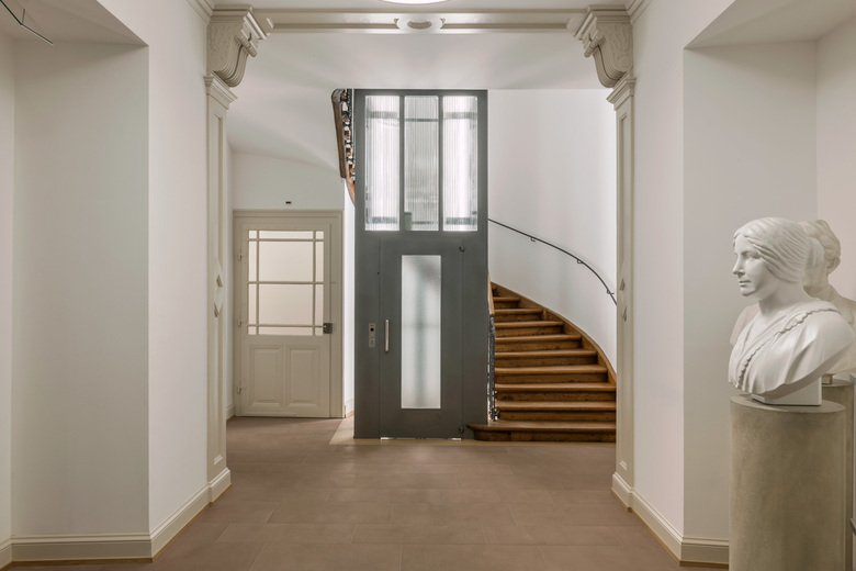 Der leuchtende gläserne Liftschacht, welcher als Beleuchtungskörper im gesamten Gebäude präsent ist und den Treppenraum und die Hallen freundlich und einladend beleuchtet, bildet dabei das Herzstück des Gebäudes. Die vom Liftbereich abgehenden Flure und sämtliche Arbeitszimmer wurden mit neuen LED-Pendelleuchten bestückt, die die neuen Räumlichkeiten zeitlos in neuem Licht erstrahlen lassen. Der neu konzipierte Dachstock wurde mit modernen linearen LED-Leuchten bestückt, die den grosszügigen Arbeitsraum büroarbeitsplatztauglich und weitläufig ausleuchten. Die gesamte Beleuchtungsanlage entspricht dabei der neusten Technik.